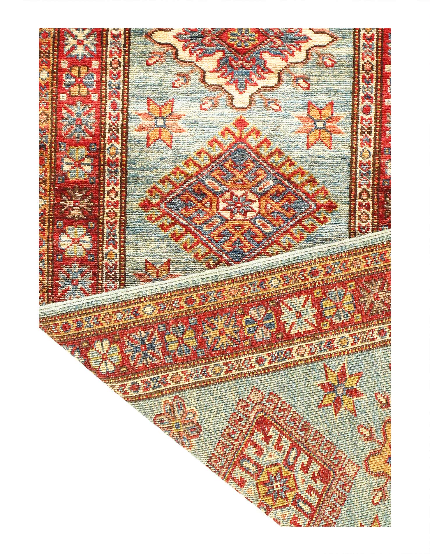 Kazak is a modern shape of old Caucasian rugs which strictly adheres to traditional design elements of the Caucasus. It has elements such as the stepped hooked polygons, geometrical medallions and rosettes, presented in more stylized manner and with a new dimension. Natural dyes produce soft luminous shades and abrashes causing a beautiful sheen. Handspun wool yarn is normally used in the variety of vibrant warm colors. Kazaks rugs in our collection are all fine quality pieces from Pakistan made with Ghazni handspun wool and natural dyes.