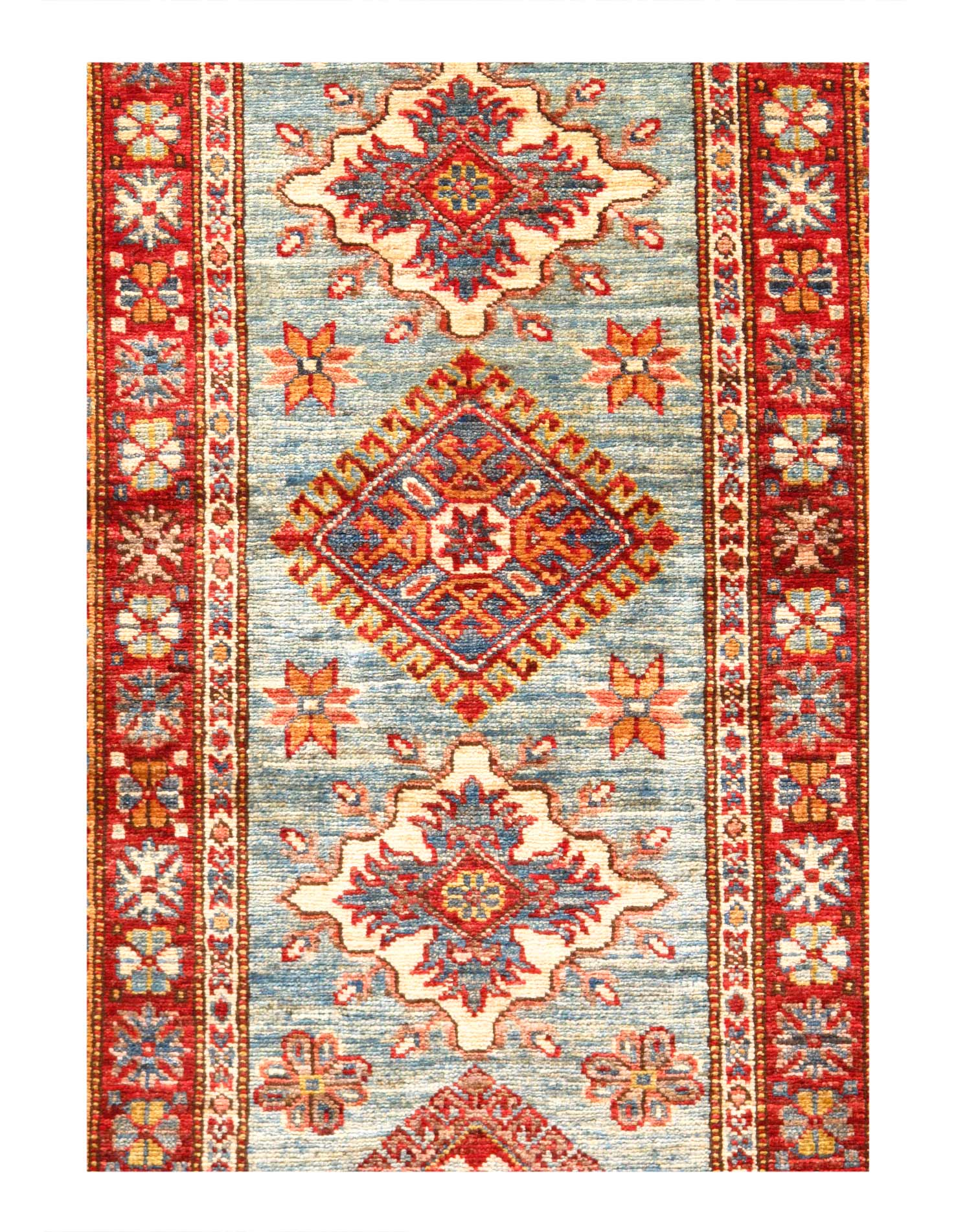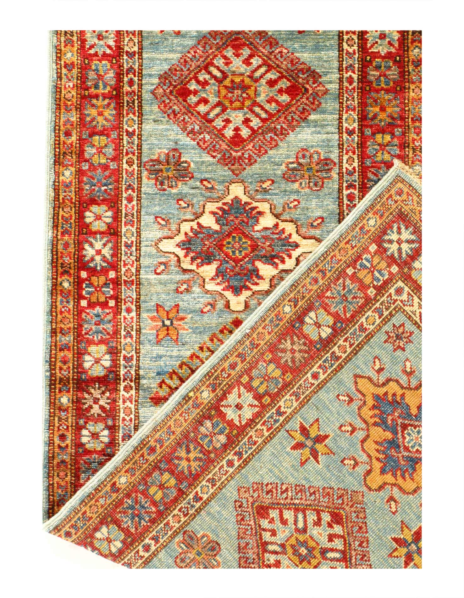 Kazak is a modern shape of old Caucasian rugs which strictly adheres to traditional design elements of the Caucasus. It has elements such as the stepped hooked polygons, geometrical medallions and rosettes, presented in more stylized manner and with a new dimension. Natural dyes produce soft luminous shades and abrashes causing a beautiful sheen. Handspun wool yarn is normally used in the variety of vibrant warm colors. Kazaks rugs in our collection are all fine quality pieces from Pakistan made with Ghazni handspun wool and natural dyes.