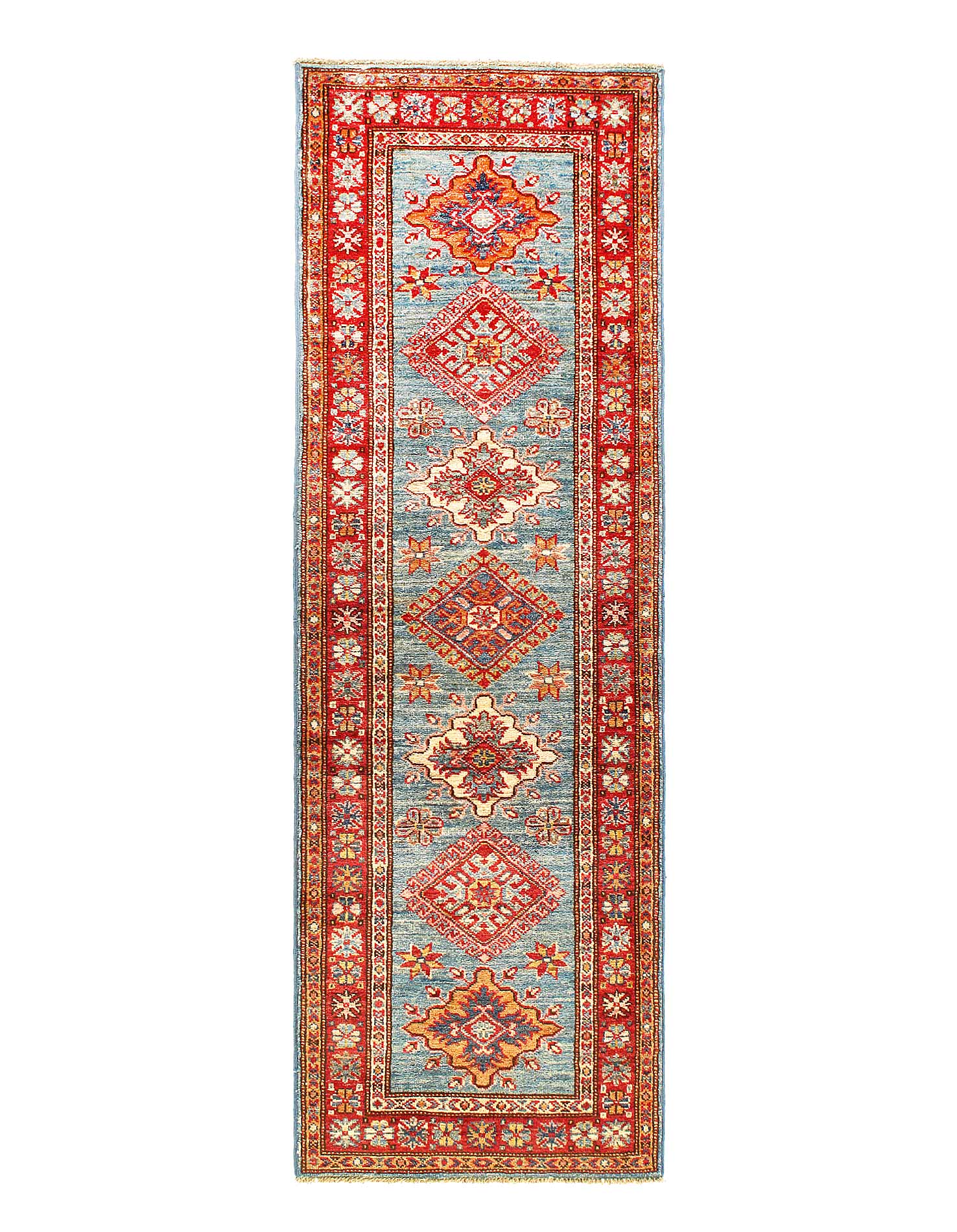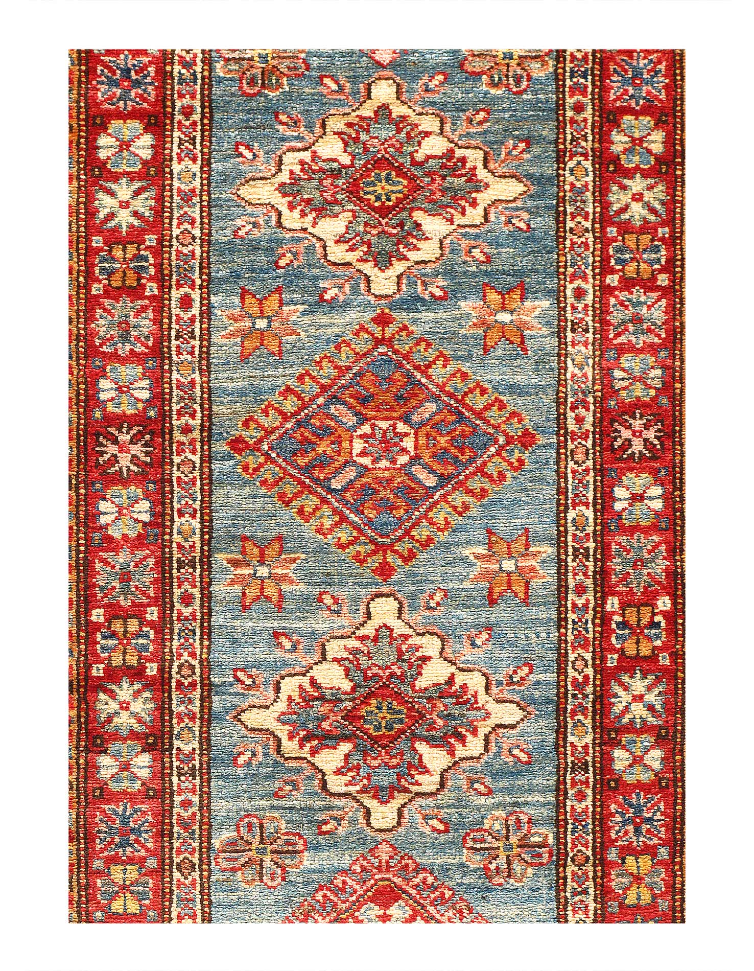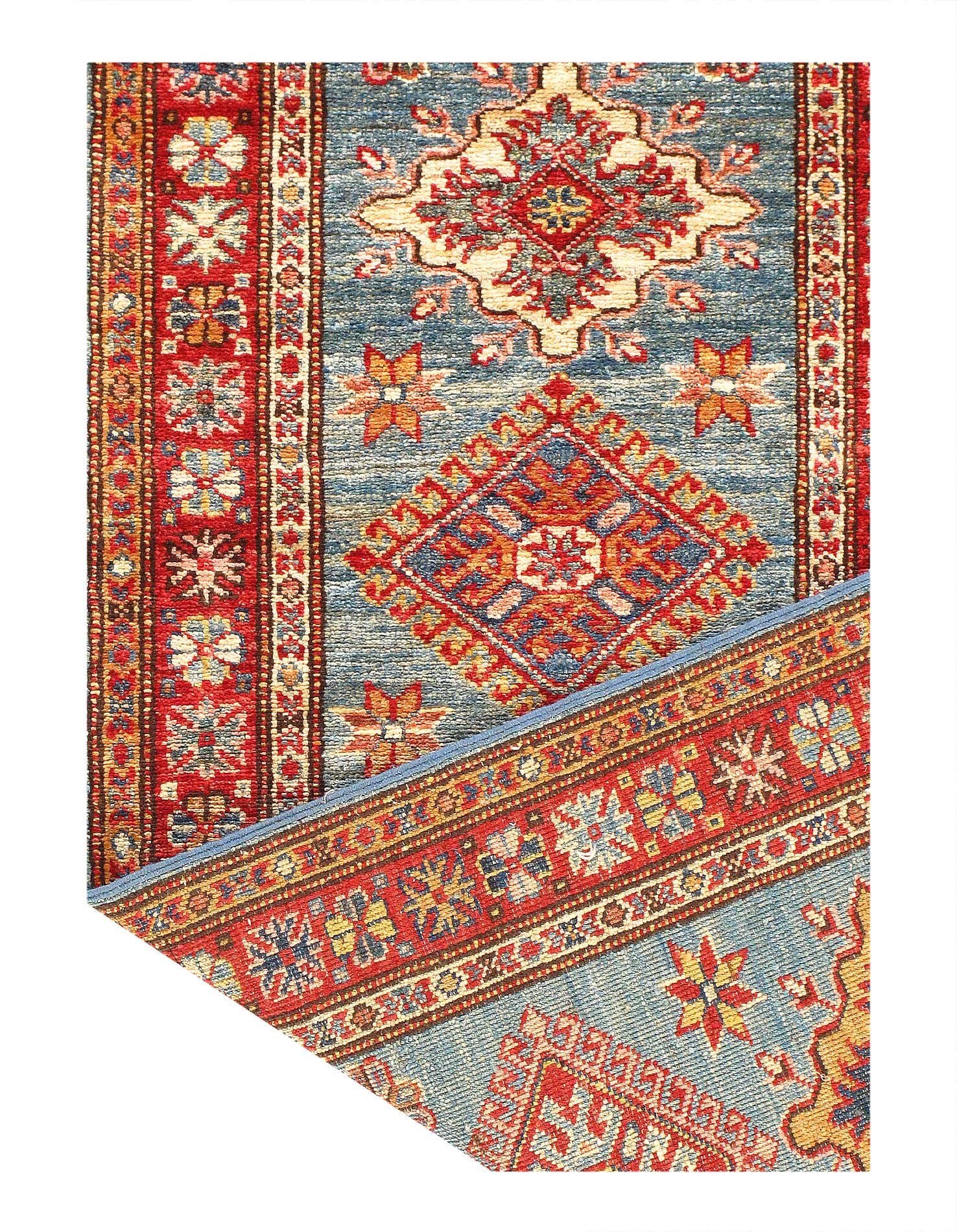 Kazak is a modern shape of old Caucasian rugs which strictly adheres to traditional design elements of the Caucasus. It has elements such as the stepped hooked polygons, geometrical medallions and rosettes, presented in more stylized manner and with a new dimension. Natural dyes produce soft luminous shades and abrashes causing a beautiful sheen. Handspun wool yarn is normally used in the variety of vibrant warm colors. Kazaks rugs in our collection are all fine quality pieces from Pakistan made with Ghazni handspun wool and natural dyes.
