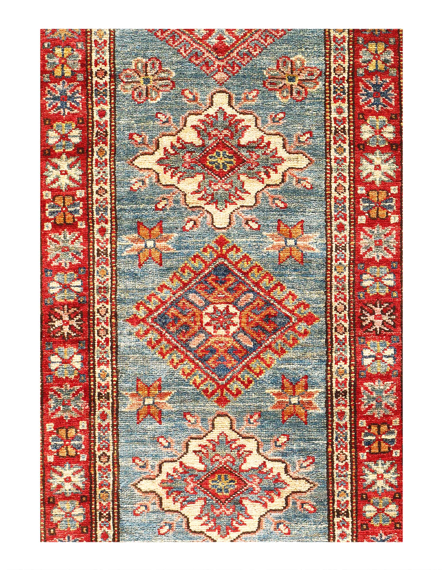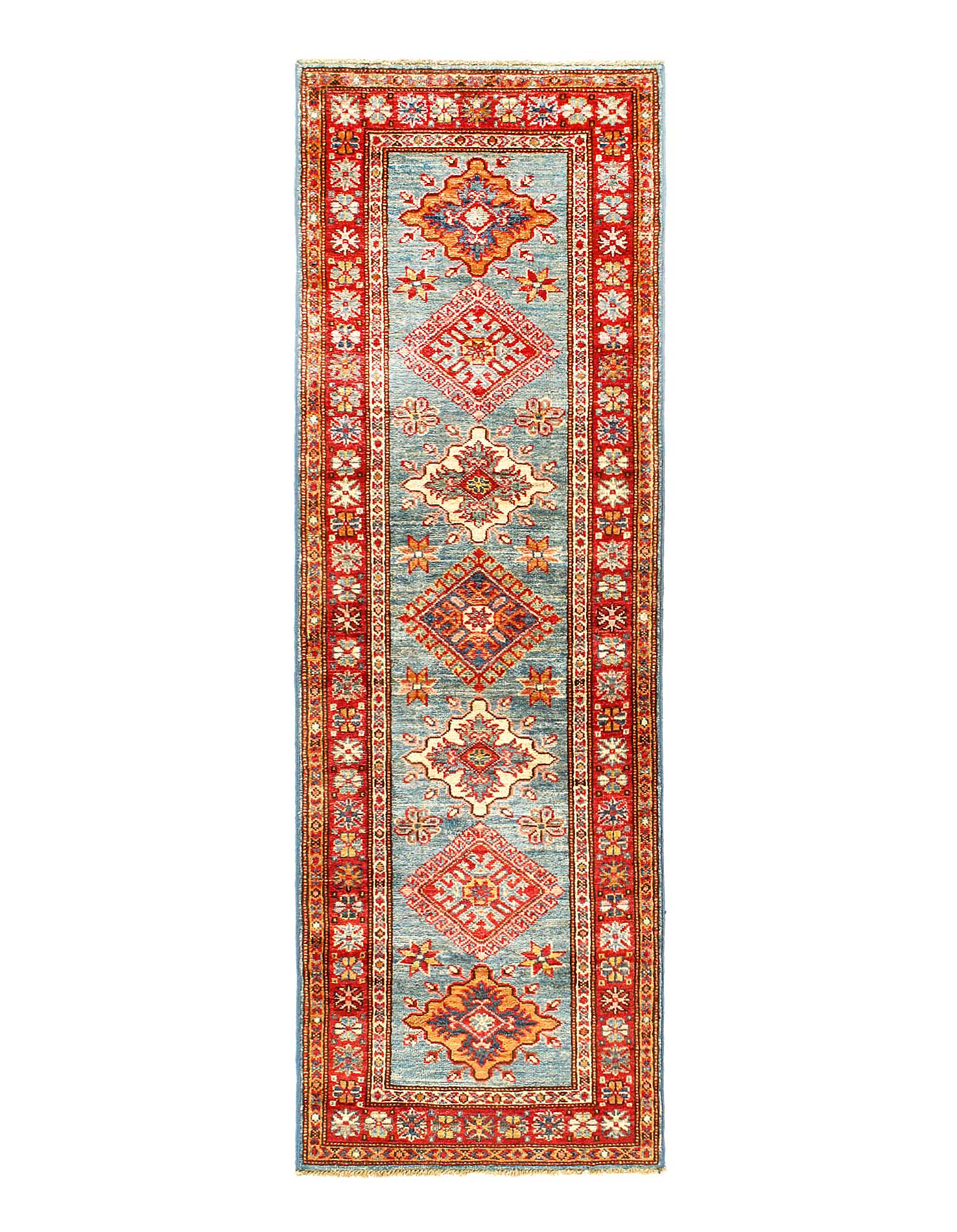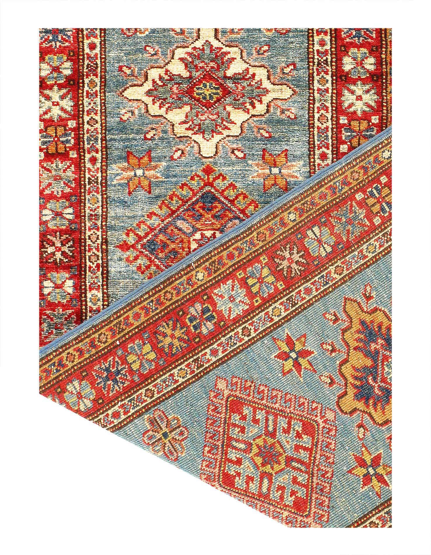 Kazak is a modern shape of old Caucasian rugs which strictly adheres to traditional design elements of the Caucasus. It has elements such as the stepped hooked polygons, geometrical medallions and rosettes, presented in more stylized manner and with a new dimension. Natural dyes produce soft luminous shades and abrashes causing a beautiful sheen. Handspun wool yarn is normally used in the variety of vibrant warm colors. Kazaks rugs in our collection are all fine quality pieces from Pakistan made with Ghazni handspun wool and natural dyes.