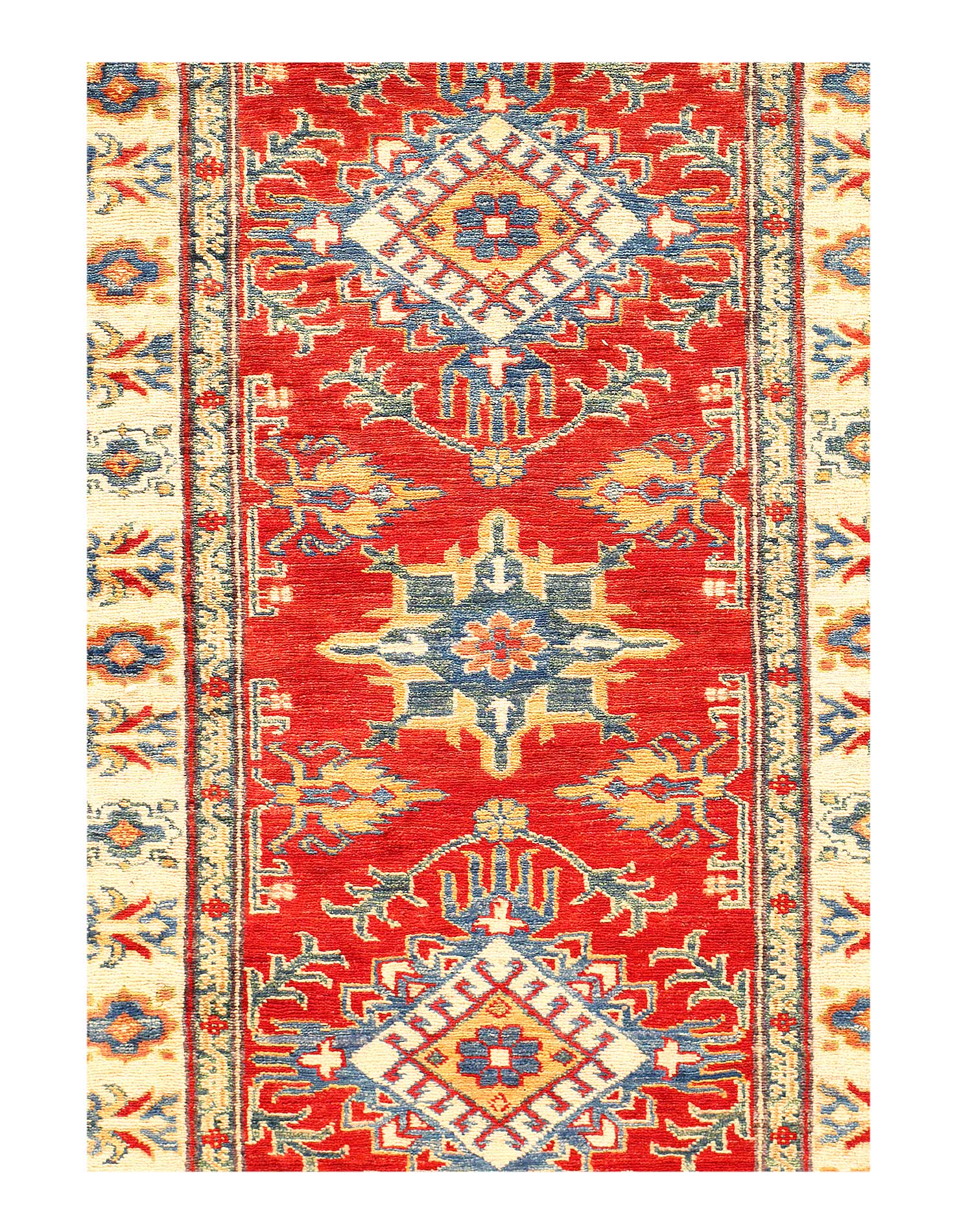 Kazak is a modern shape of old Caucasian rugs which strictly adheres to traditional design elements of the Caucasus. It has elements such as the stepped hooked polygons, geometrical medallions and rosettes, presented in more stylized manner and with a new dimension. Natural dyes produce soft luminous shades and abrashes causing a beautiful sheen. Hand spun wool yarn is normally used in the variety of vibrant warm colors. Kazaks rugs in our collection are all fine quality pieces from Pakistan made with Ghazni handspun wool and natural dyes.
