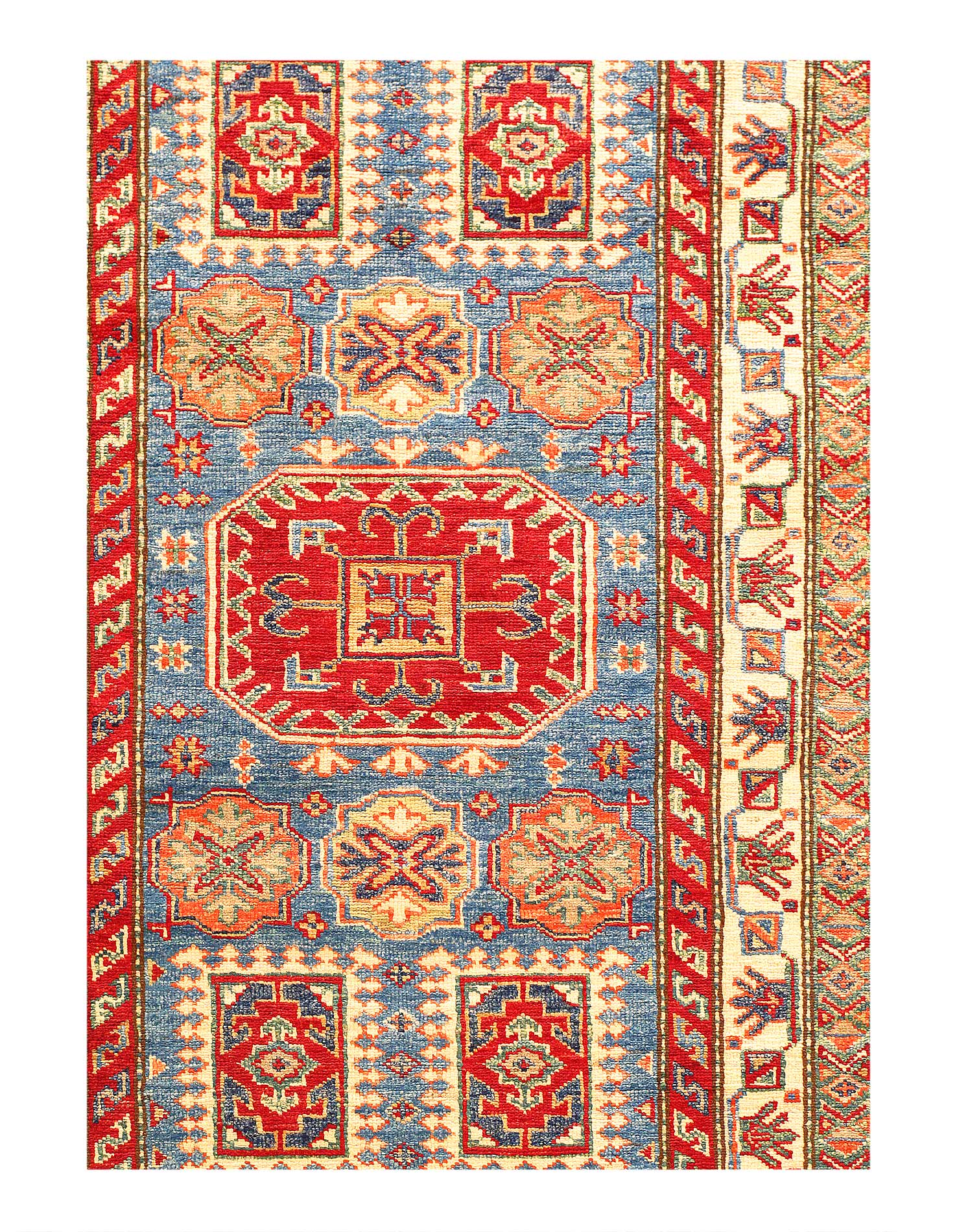 Kazak is a modern shape of old Caucasian rugs which strictly adheres to traditional design elements of the Caucasus. It has elements such as the stepped hooked polygons, geometrical medallions and rosettes, presented in more stylized manner and with a new dimension. Natural dyes produce soft luminous shades and abrashes causing a beautiful sheen. Handspun wool yarn is normally used in the variety of vibrant warm colors. Kazaks rugs in our collection are all fine quality pieces from Pakistan made with Ghazni handspun wool and natural dyes.