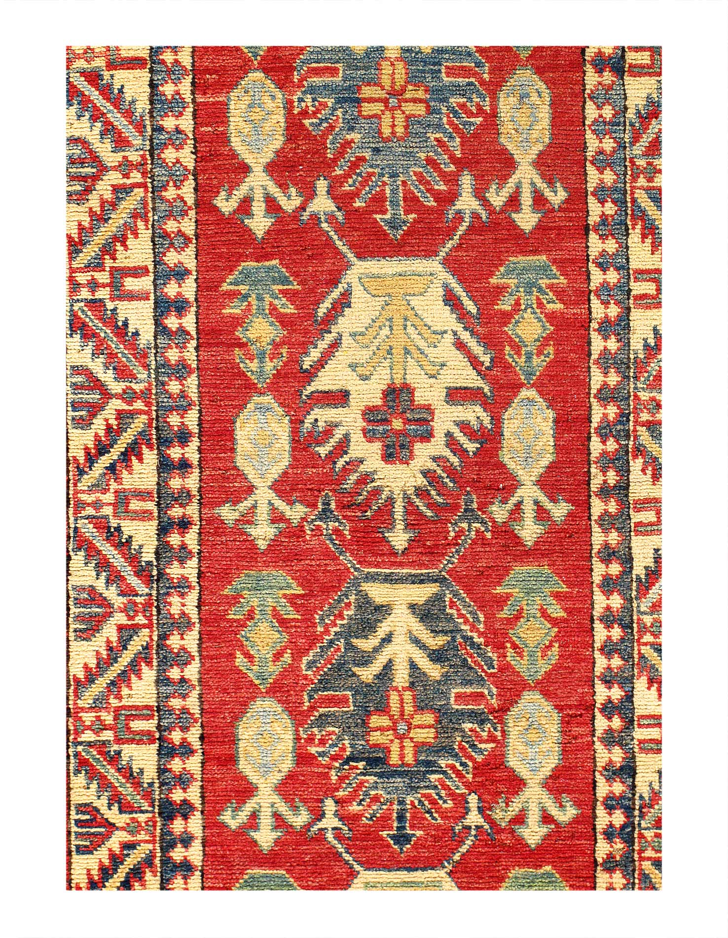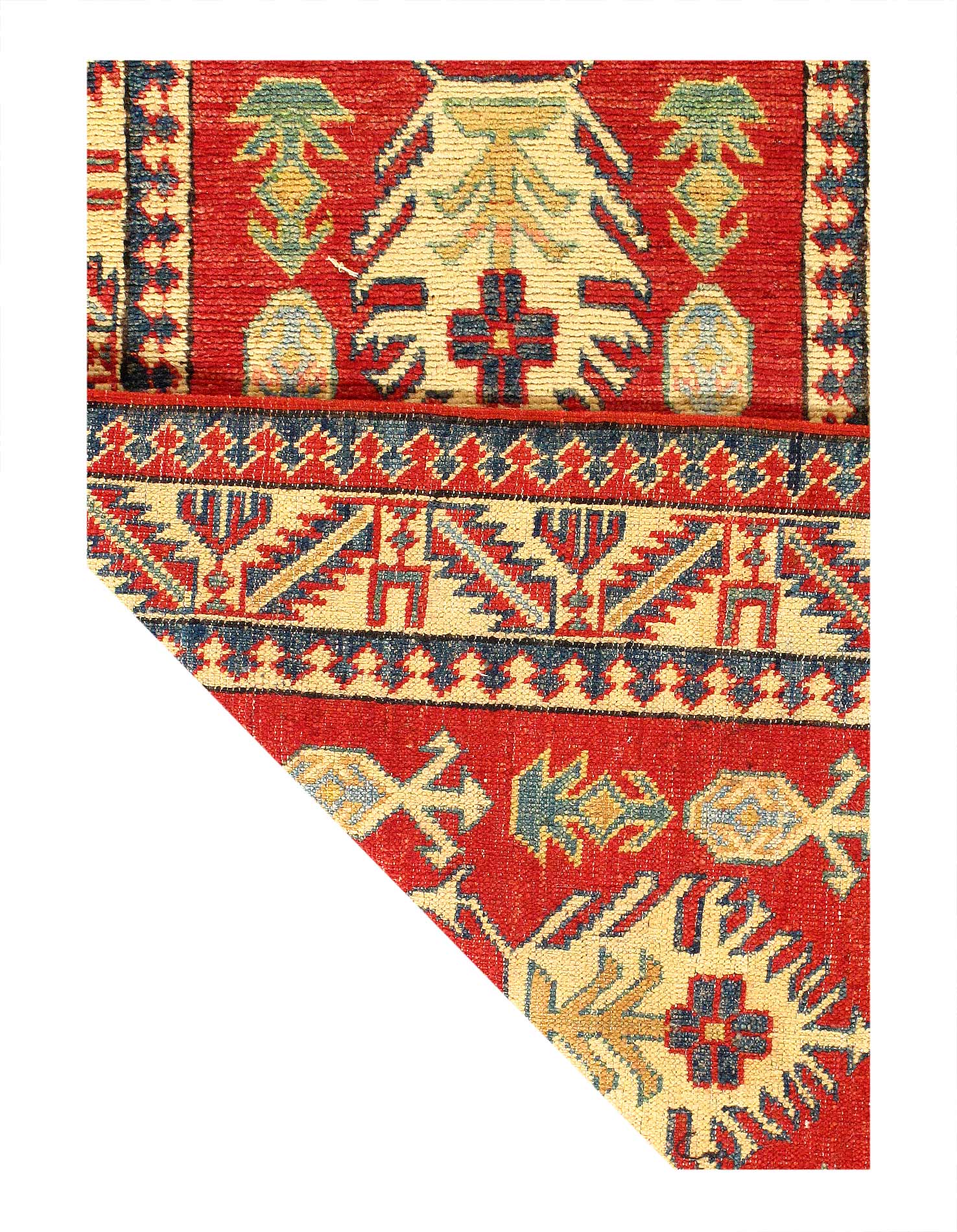 Vegetable Dyed,This rug is handmade from 100-percent premium, hand-spun wool, and employ ancient pot-dying techniques to give them their authentic look.This rug is handmade from 100-percent premium, hand-spun wool, and employ ancient pot-dying techniques to give them their authentic look.Kazak is a modern shape of old Caucasian rugs which strictly adheres to traditional design elements of the Caucasus. It has elements such as the stepped hooked polygons, geometrical medallions and rosettes, presented in more stylized manner and with a new dimension. Natural dyes produce soft luminous shades and abrashes causing a beautiful sheen. Hand spun wool yarn is normally used in the variety of vibrant warm colors. Kazaks rugs in our collection are all fine quality pieces from Pakistan made with Ghazni handspun wool and natural dyes.