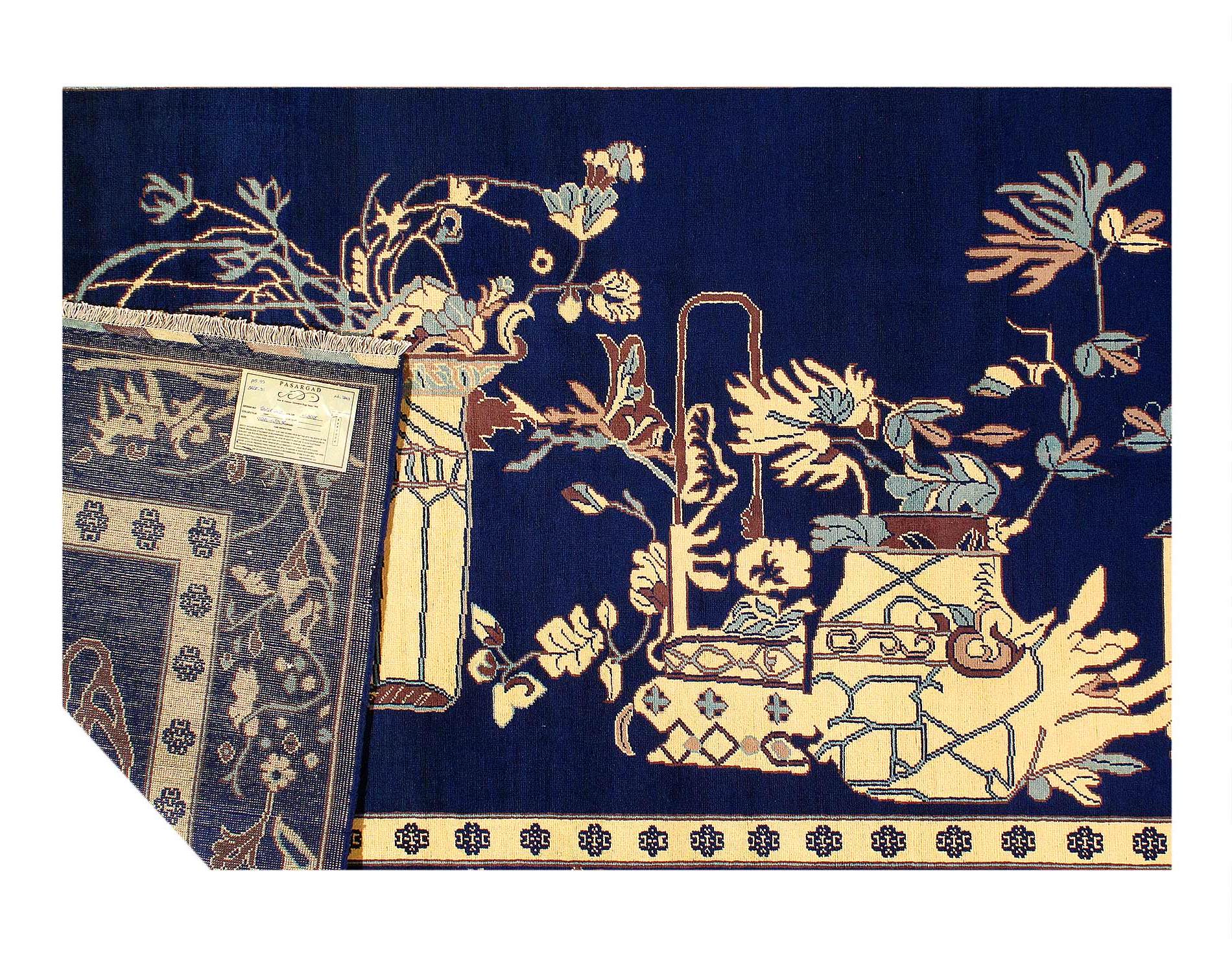 This rug is a unique piece of world art that will enhance your living space. These Khotan rugs were originally produced in the city of Khotan, which was located in Eastern Turkestan. Khotan villages produced beautiful rugs throughout the 18th and 19th centuries. The knot count is 180. The pile height is 0.25 inches . Colors include Navy Blue , orange, Gold, ivory