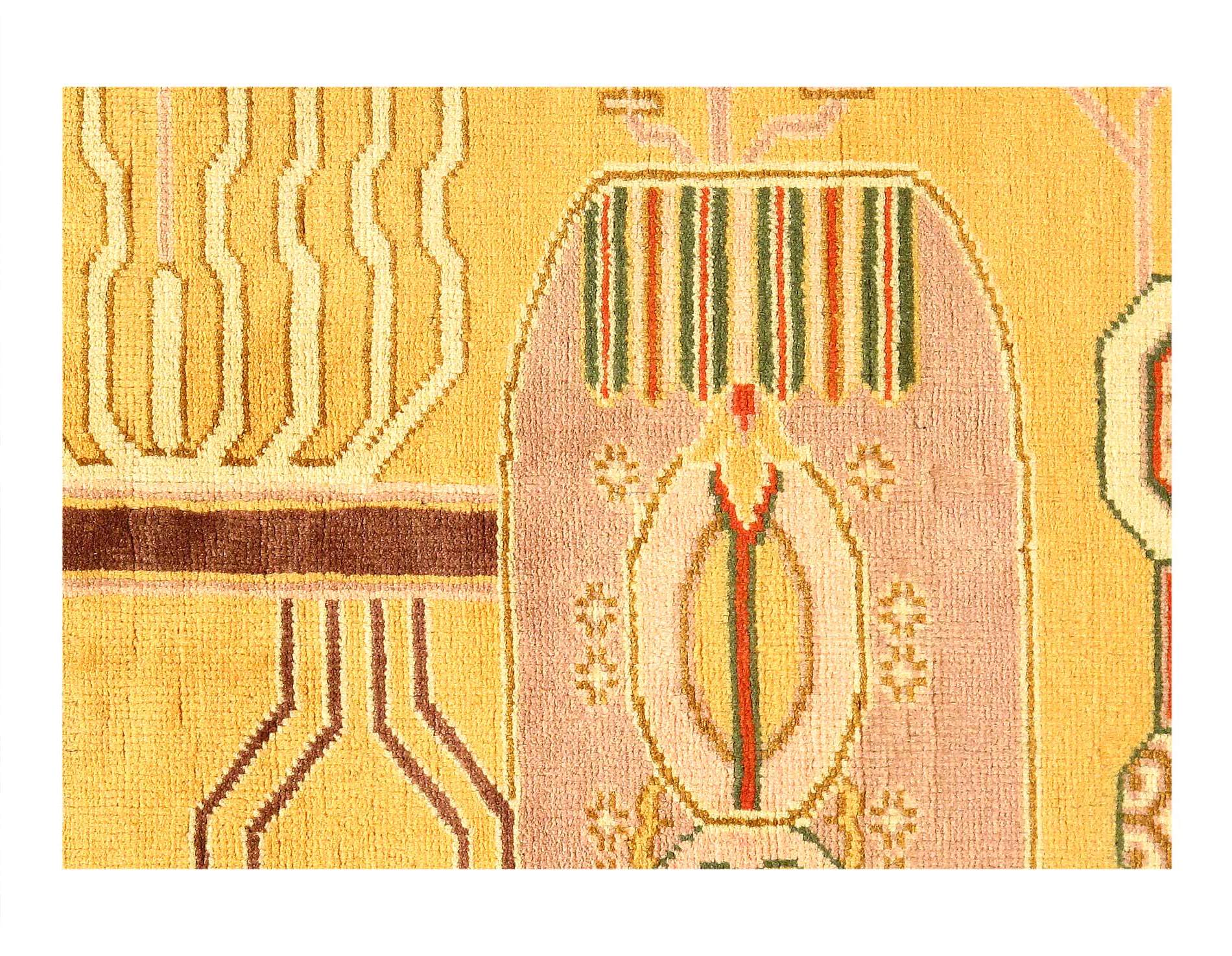 This rug is a unique piece of world art that will enhance your living space. These Khotan rugs were originally produced in the city of Khotan, which was located in Eastern Turkestan. Khotan villages produced beautiful rugs throughout the 18th and 19th centuries. The knot count is 180. The pile height is 0.25 inches . Colors include rust, orange, Gold
