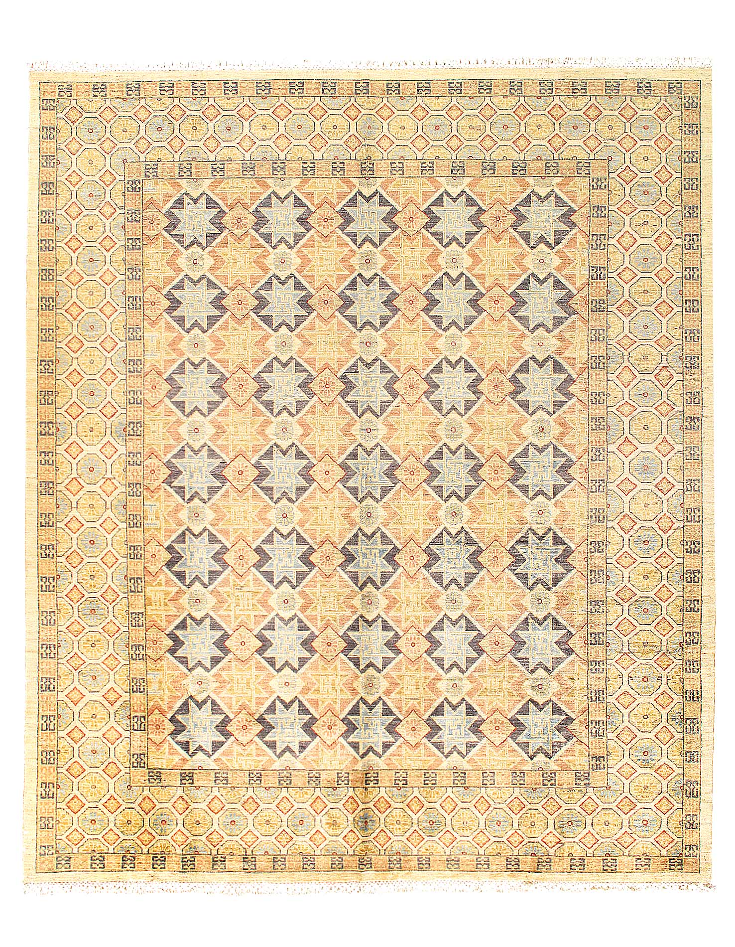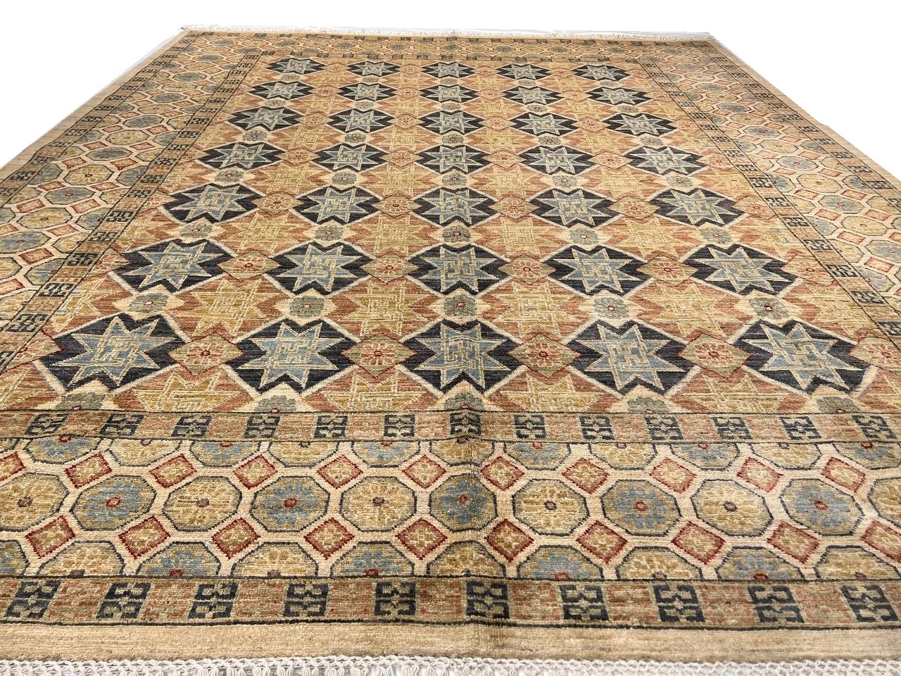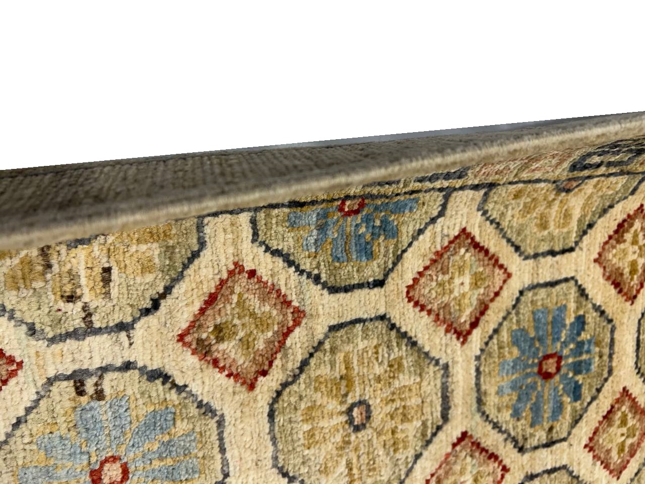 This rug is a unique piece of world art that will enhance your living space. These Khotan rugs were originally produced in the city of Khotan, which was located in Eastern Turkestan with 100% New Zealand Wool, the beautifully woven repetitive geometric and abstract designs evoke a sophisticated beauty that can't be matched.. Khotan villages produced beautiful rugs throughout the 18th and 19th centuries. The knot count is 250 TO 300. The pile height is 0.25 inches .