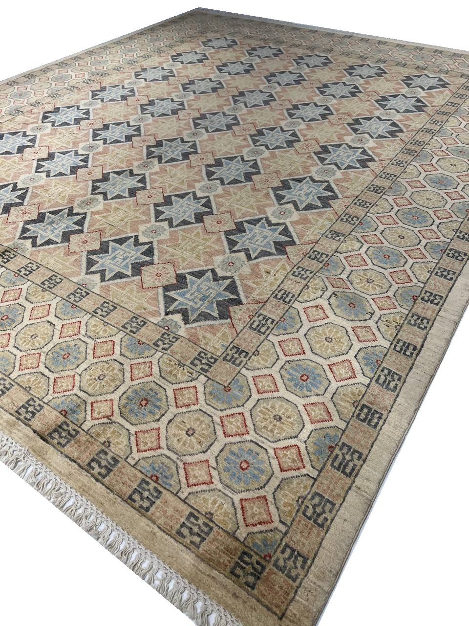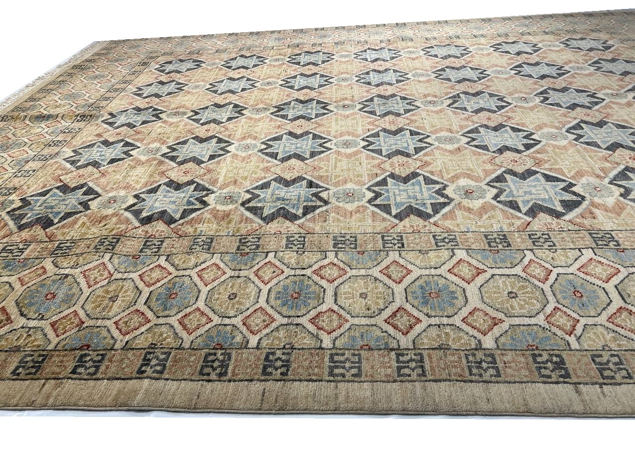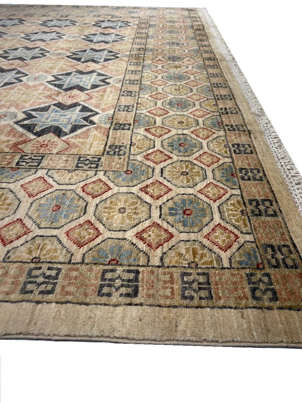 This rug is a unique piece of world art that will enhance your living space. These Khotan rugs were originally produced in the city of Khotan, which was located in Eastern Turkestan with 100% New Zealand Wool, the beautifully woven repetitive geometric and abstract designs evoke a sophisticated beauty that can't be matched.. Khotan villages produced beautiful rugs throughout the 18th and 19th centuries. The knot count is 250 TO 300. The pile height is 0.25 inches .