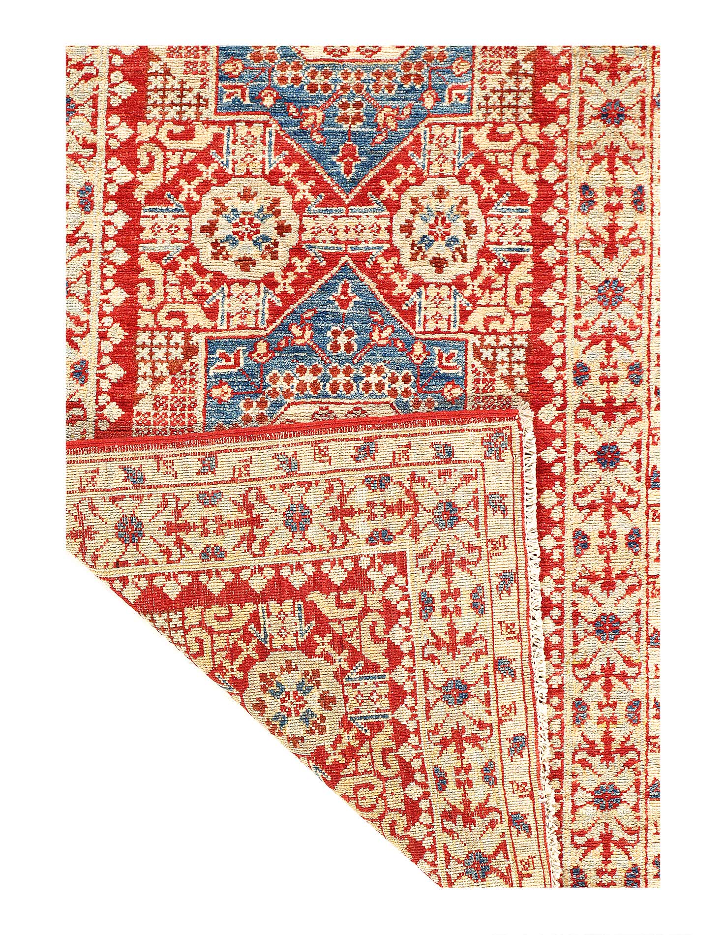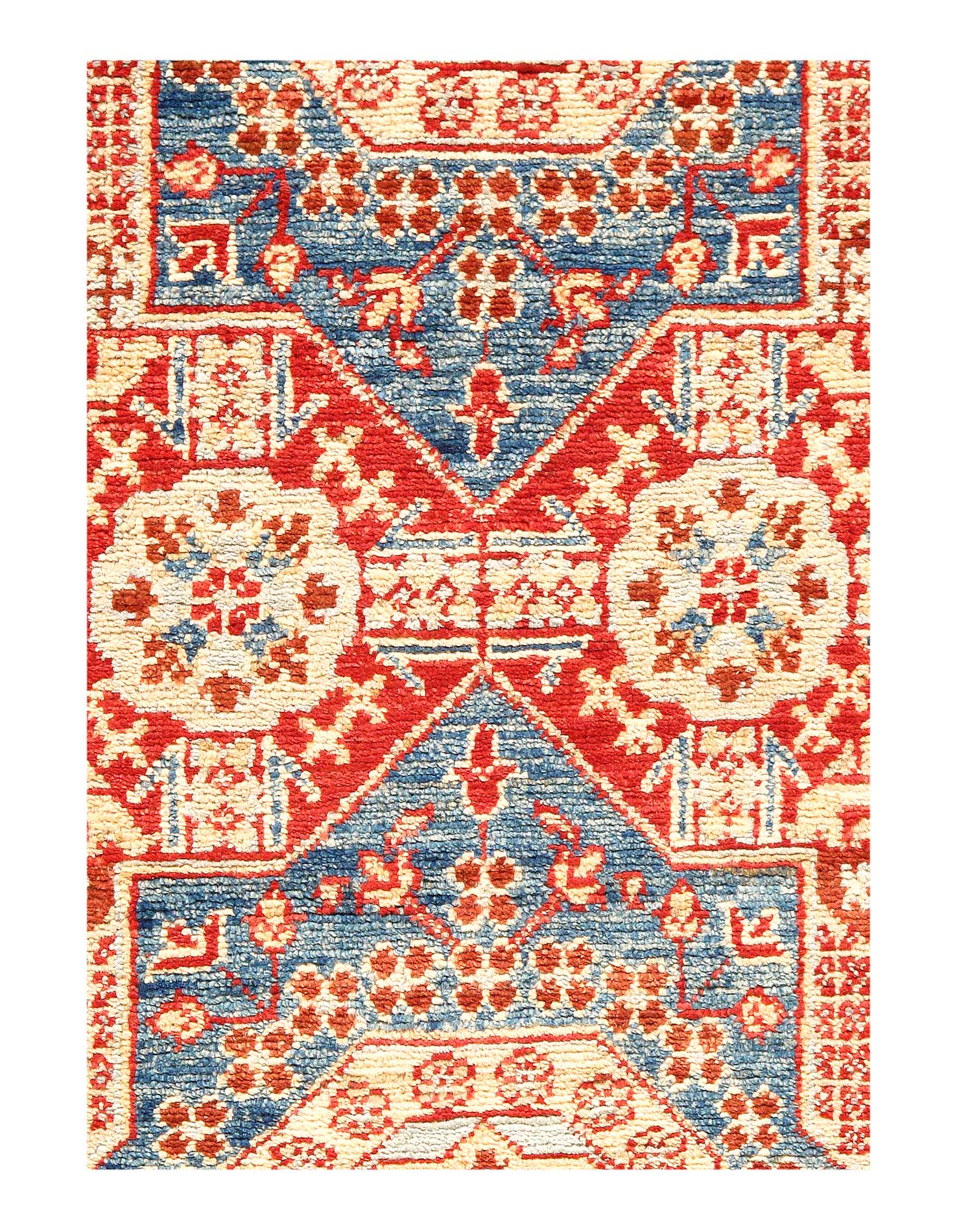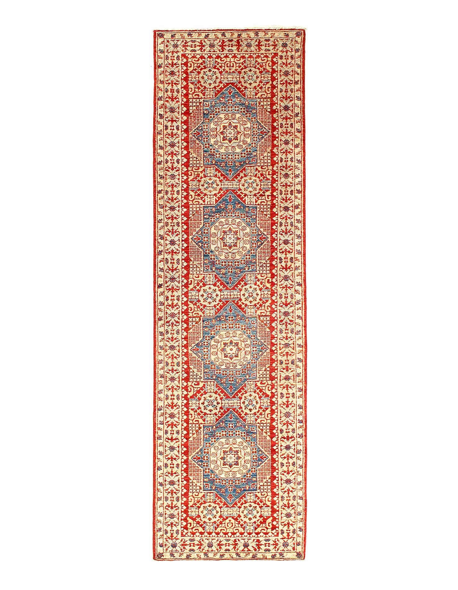 Afghan-made Egyptian Mamluk design in updated colors with colorful ; hand-knotted of hand-spun, vegetable-dyed Ghazni wool in Afghanistan; exported from Pakistan
