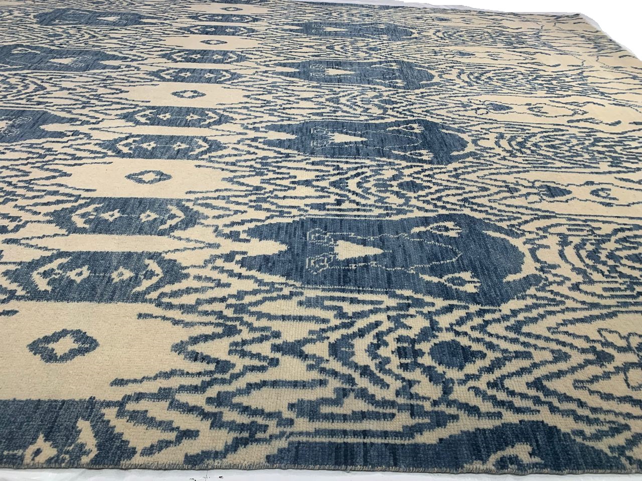 With its element of comfort, artistic statement and functional versatility, this contemporary rug will create a stunning focal point. Rather than sticking to a traditional modern style and risking a rather flat outcome, Indian artisans skillfully combined abstract style with the trending erased pattern creating this beautiful work of art. This balancing effect of modern abstract design with cool colors and subtle luminosity from the silky shimmers evoke the interior ornamental detail and coloration throughout and contrast beautifully with the overall design. Sporting a simple yet effortlessly sophisticated look, this contemporary style rug is very versatile. With its show-stopping antique style and luxurious blend of modernism and abstract design, this rug will work well with transitional, modern and contemporary interiors. Hand-knotted wool on cotton Made in India.