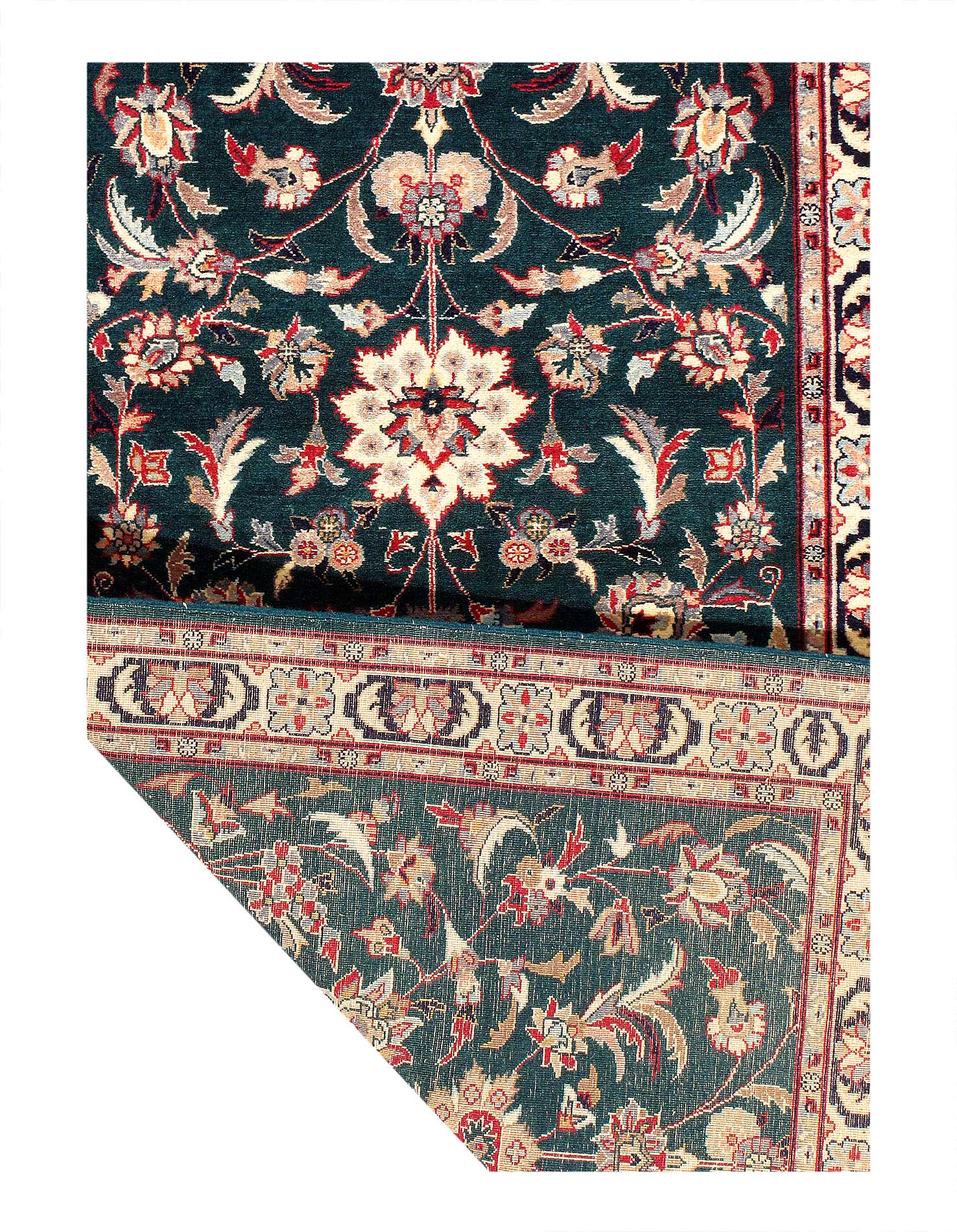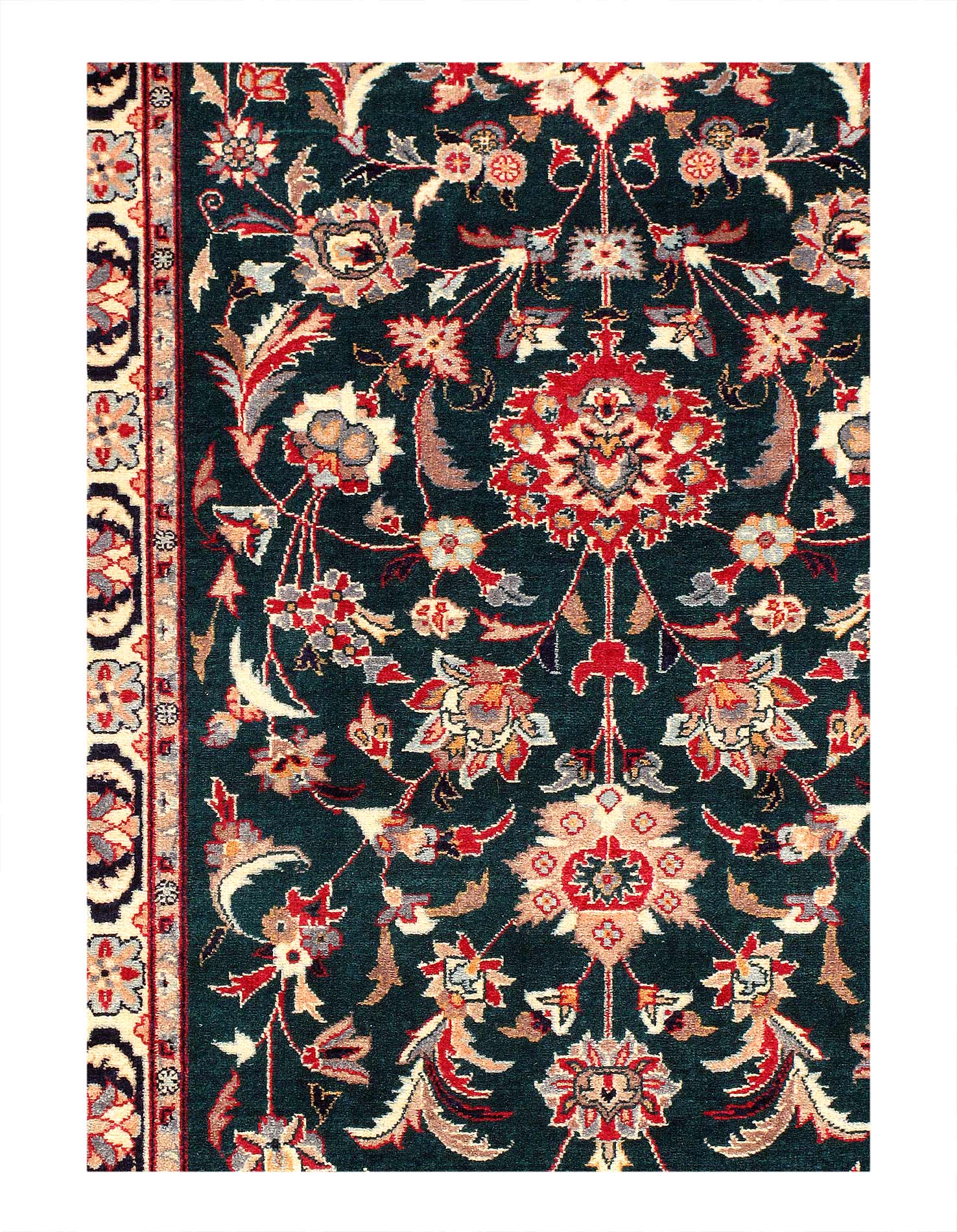 This is a hand-knotted TABRIZ design rug. The piece is made of wool and hand-spun wool from India. This rug has a dense, soft pile, and excellent quality, to ensure that you will enjoy the look and feel of your rug for years to come.