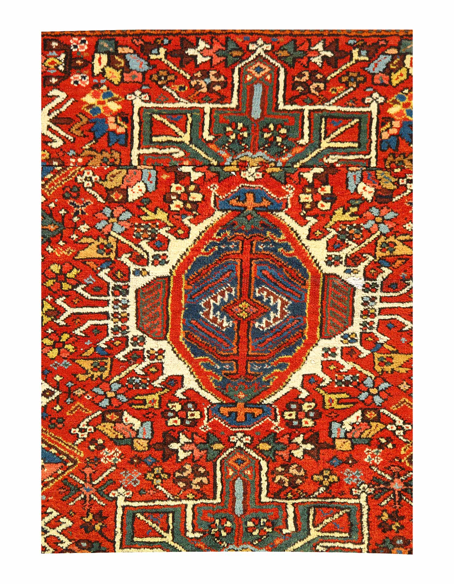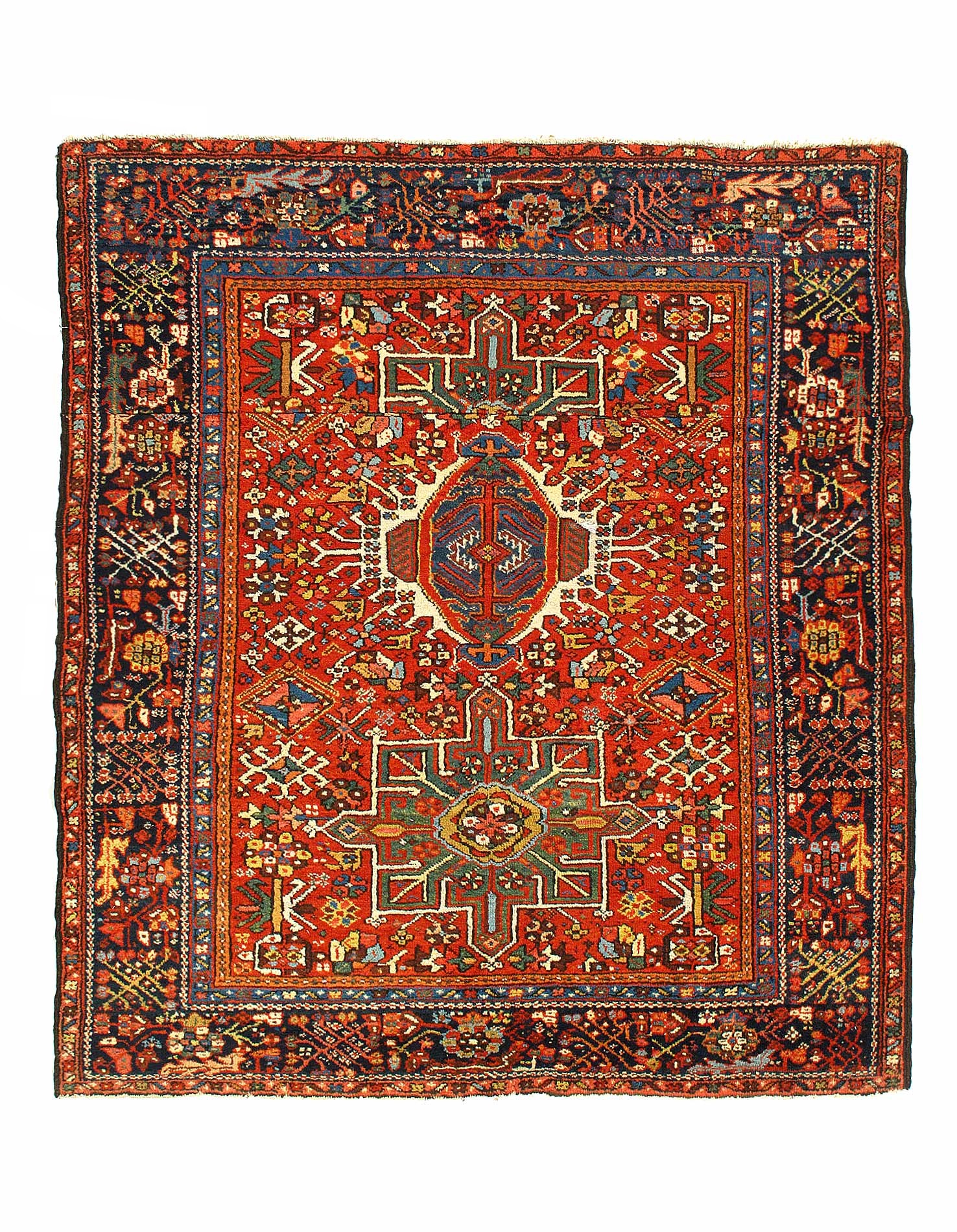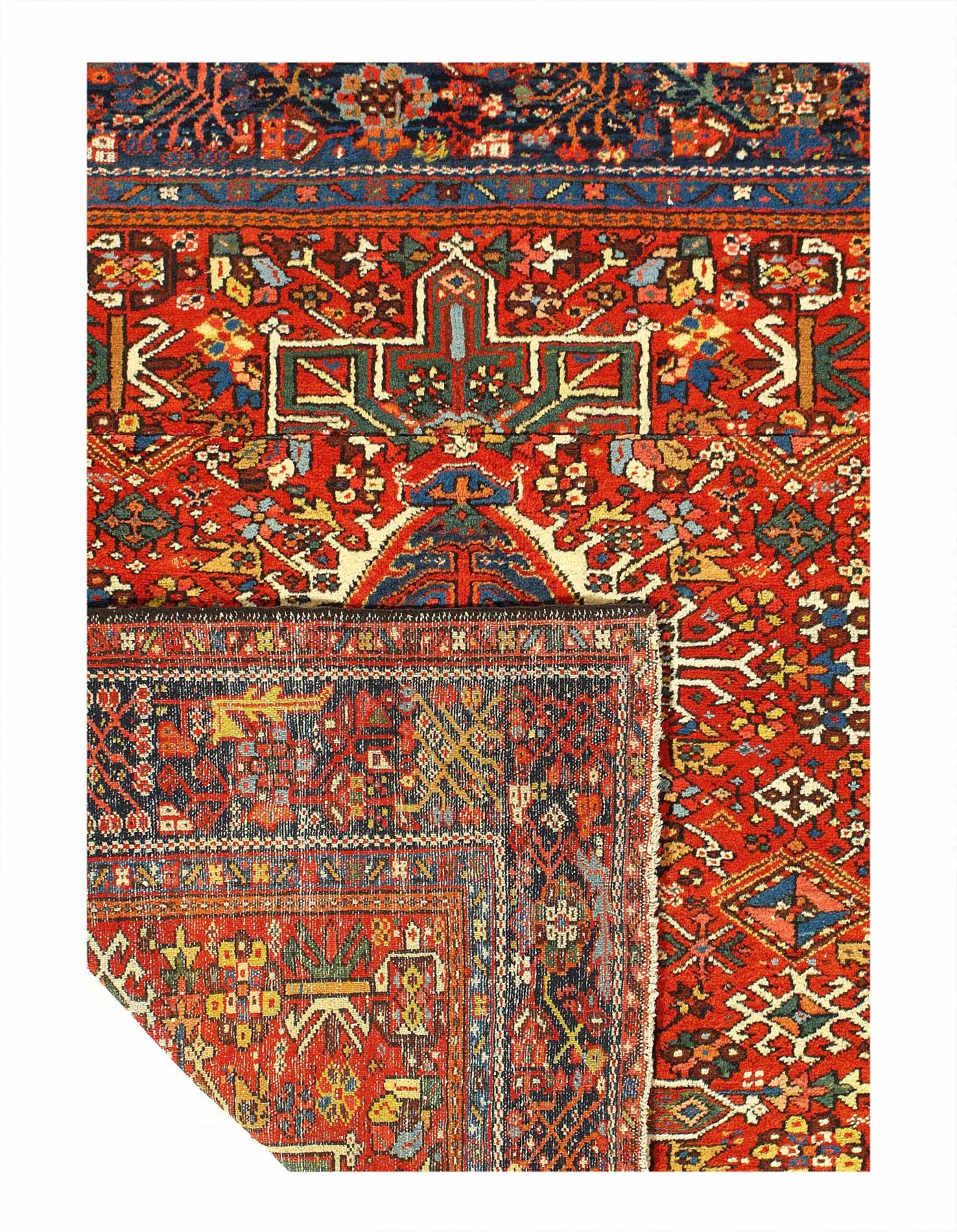 Established with luxurious jewel tones, this antique Karaje rug from Persia is a striking piece. It is engagingly accented with a brilliant white and tangerine tone, which play off of the cool-toned turquoise and navy elements to create an alluring design. This 1920โs beauty features a generous number of floral borders that seamlessly draw the eye to the center of the work. Its overall theme can be described as tribal, with the focal point featuring a diamond surrounded by florets of varying sizes and shapes, set in a field of deep navy. This was owned by Blair House, also known as The President's Guest House, is an official residence in Washington, D.C., the capital of the United state.