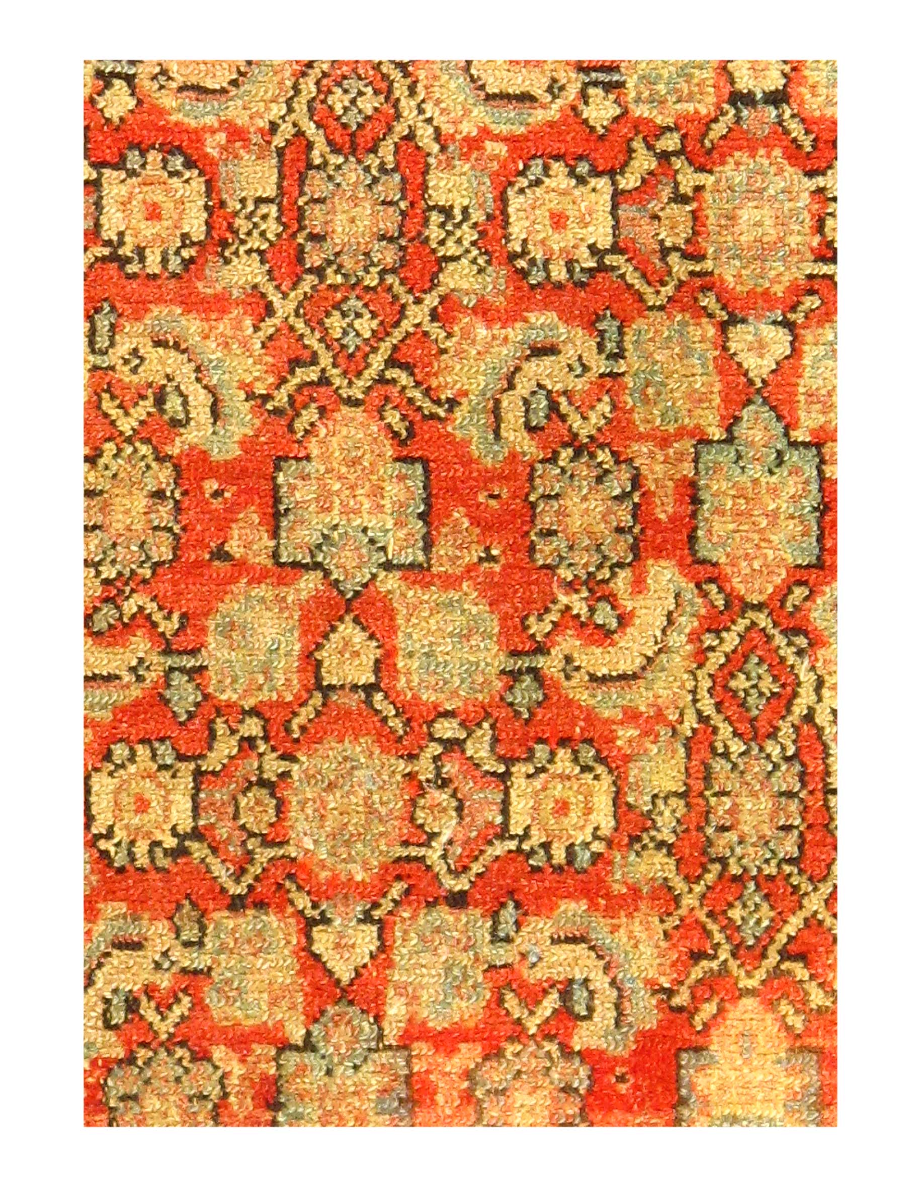 The finely woven Senneh kilims are slit tapestries of the highest quality. Their small-scale borders are carried around the ends, as they are typically in pile carpets but rarely in such weavings. Senneh seems to have been a favourite place of manufacture for saddle cloths, those in pile usually provided with a two-slope arch. Although the town of Senneh has given its name to the asymmetrical Persian knot, it is the Turkish, or symmetrical, knot, that is actually used there,