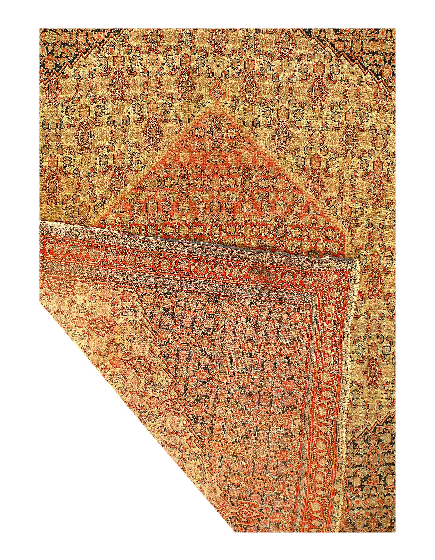 Antique Senneh rugs are one of the most distinctive of all Persian Rugs. Even though the designs are often copied by Bidjar Rugs and Tabriz Rugs but just touching the rugs . Antique Senneh rugs use very tightly spun fine mountain wool. The pile is wondrously silky but the back is scratchy so much so that people compare the backs to sandpaper. Once you eel it it it is unmistakable thereafter. Antique Senneh rugs are fine and durable and are most appreciated by people who know Persian Rugs. The new Senneh rugs are completely diferent
