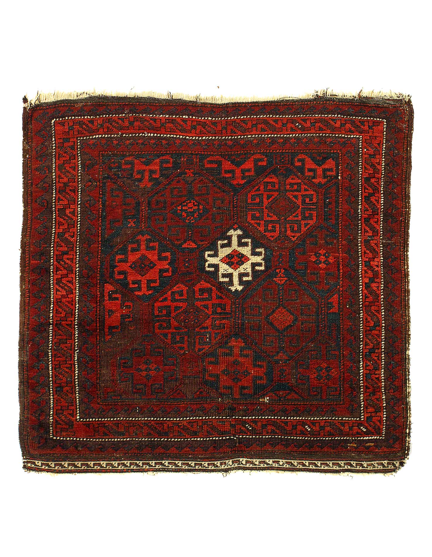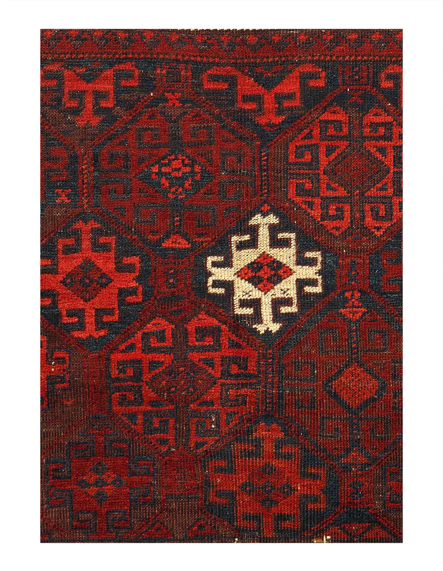 This rug is a unique piece of world art that will enhance your living space. The majority of Balouchi rugs are woven in the province Sistan-Baluchistan, which is in the Southeastern part of Iran. A lot of Balouchi rugs also come out of Iran's vast province of Khorassan which is just to the north. Balouchi rugs typically have geometric patterns and lively designs, and dominant colors include blues, reds and browns. The knot count per square inch for this rug is 180. The pile height is 0.25 inches. This rug is made of 100% wool. Colors are in shades of black, red, ivory, brown.