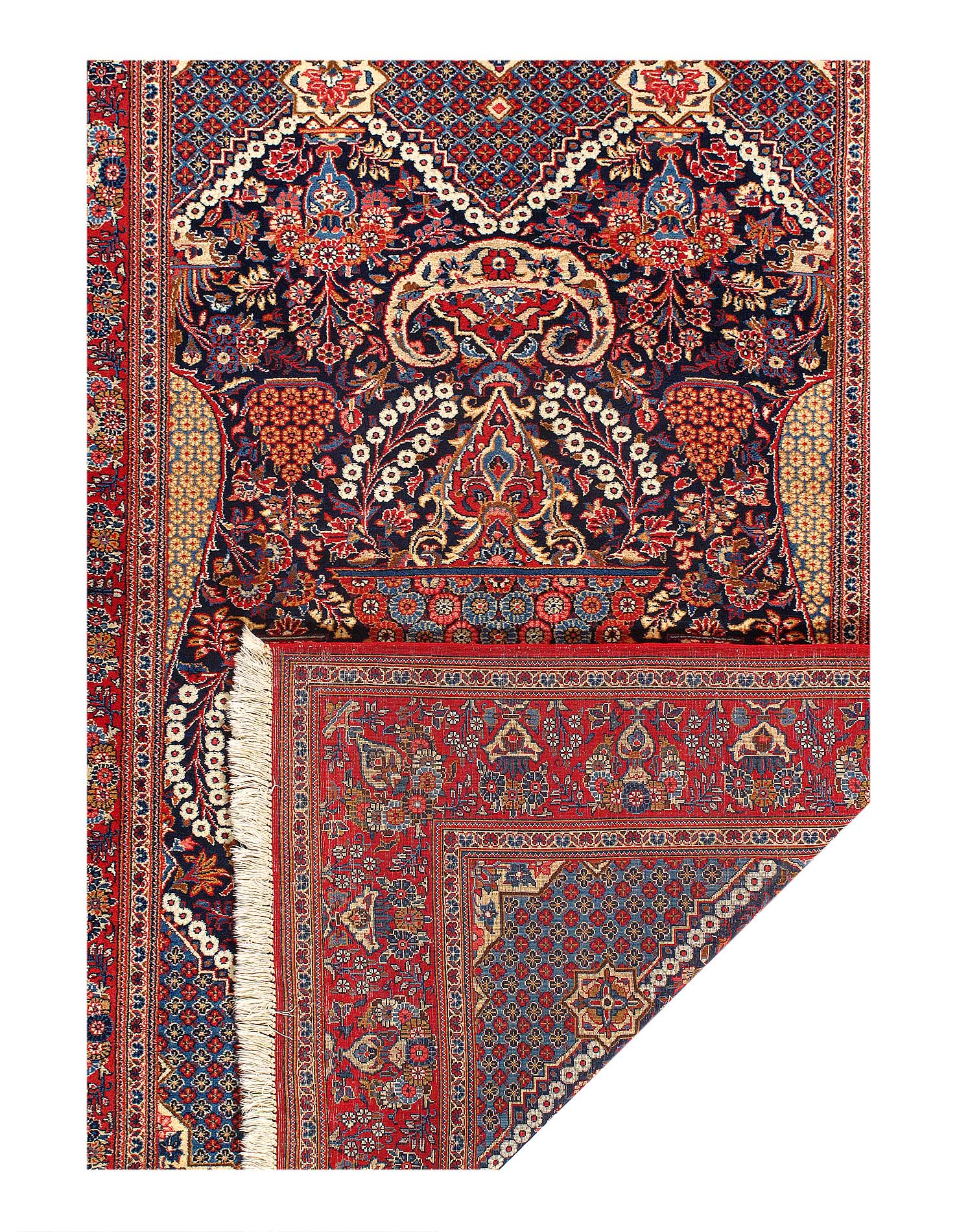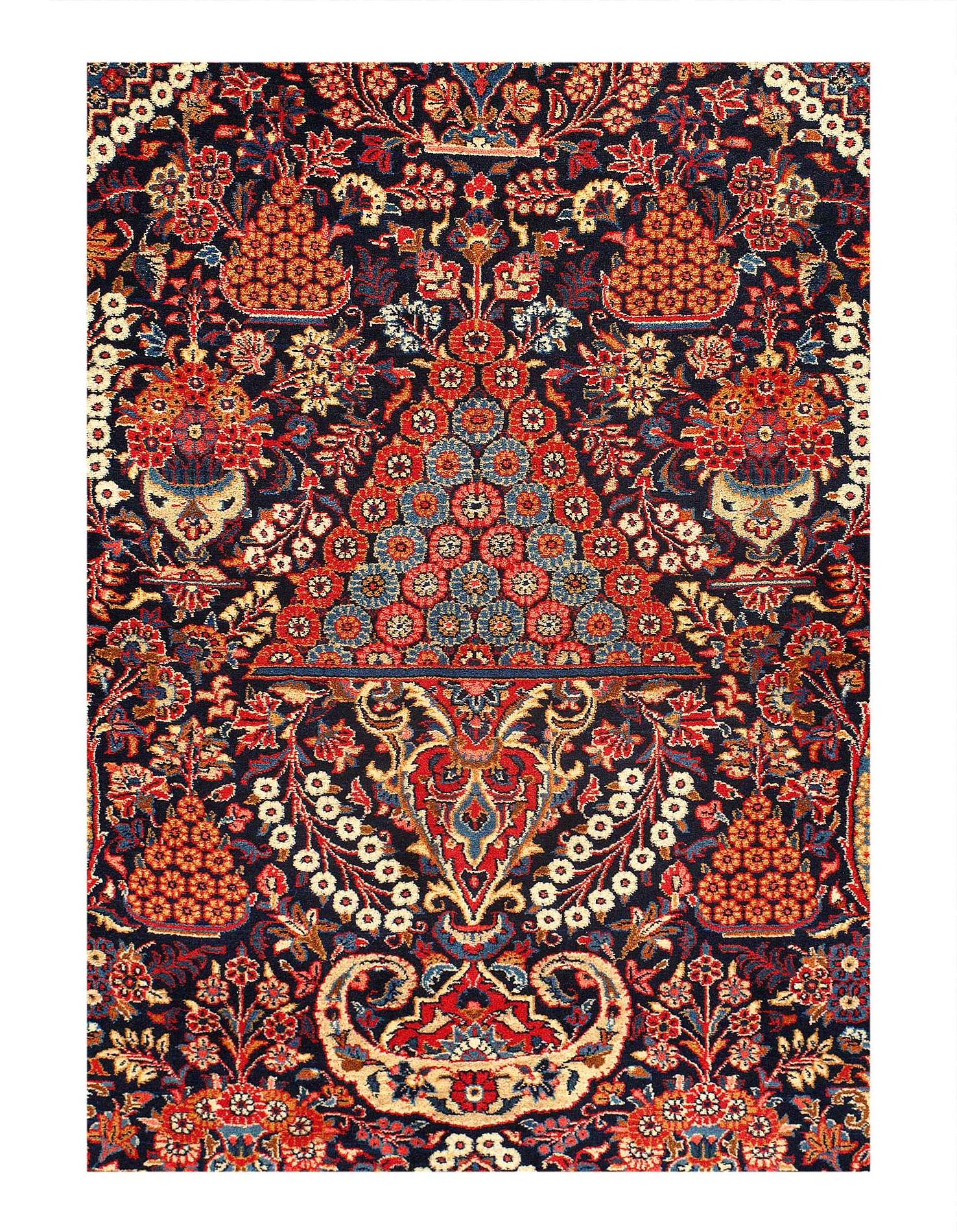 A lush array of spiraling vines, palmettes, and flowering plants repeats in rhythmic symmetry across the soft red field of this classically elegant antique Kashan. A striking and unusual border of flowering shrubs arranged in inverse repetition around a stepped zig-zag is set against a deep navy ground, providing a contrast in design and color to the field pattern.