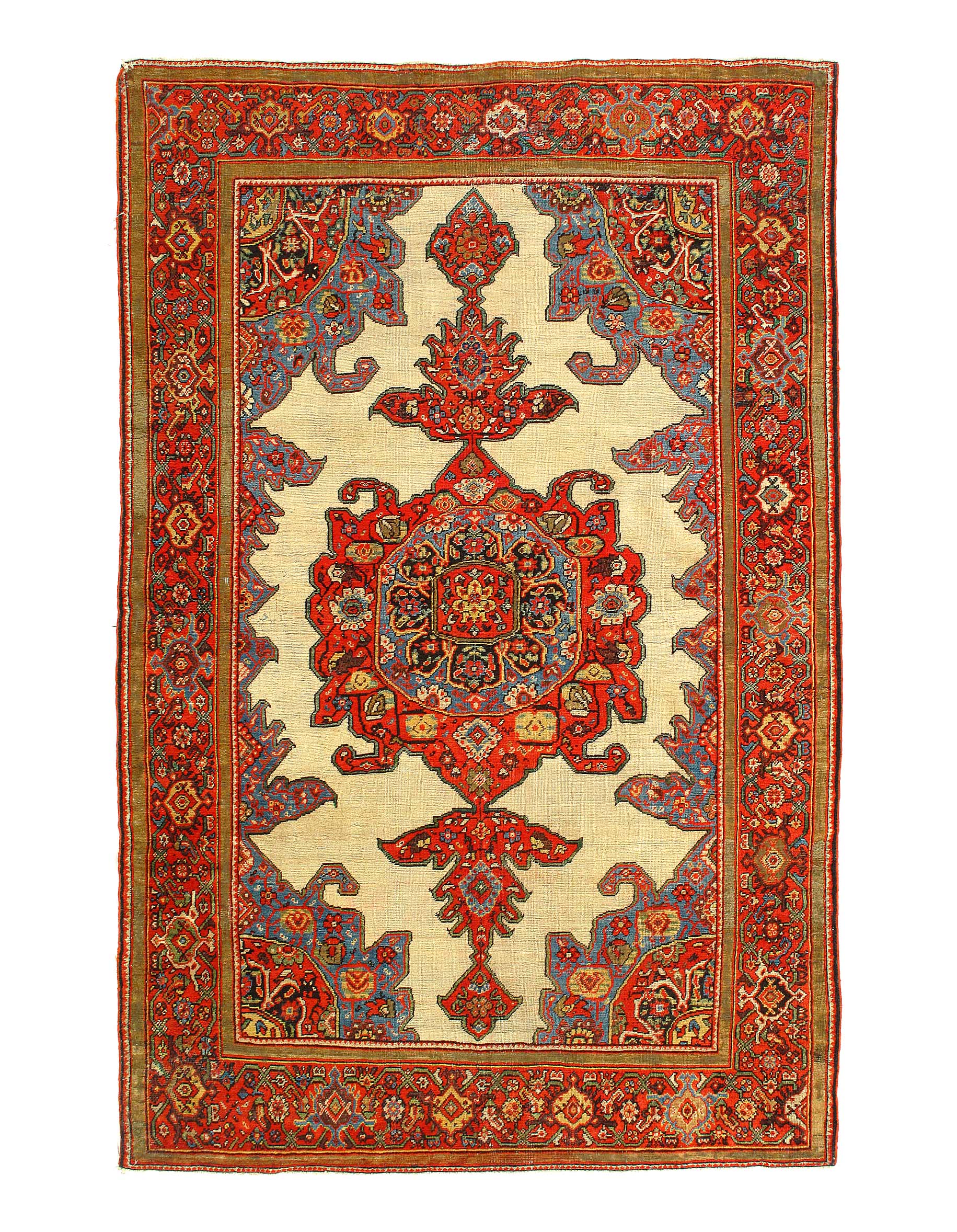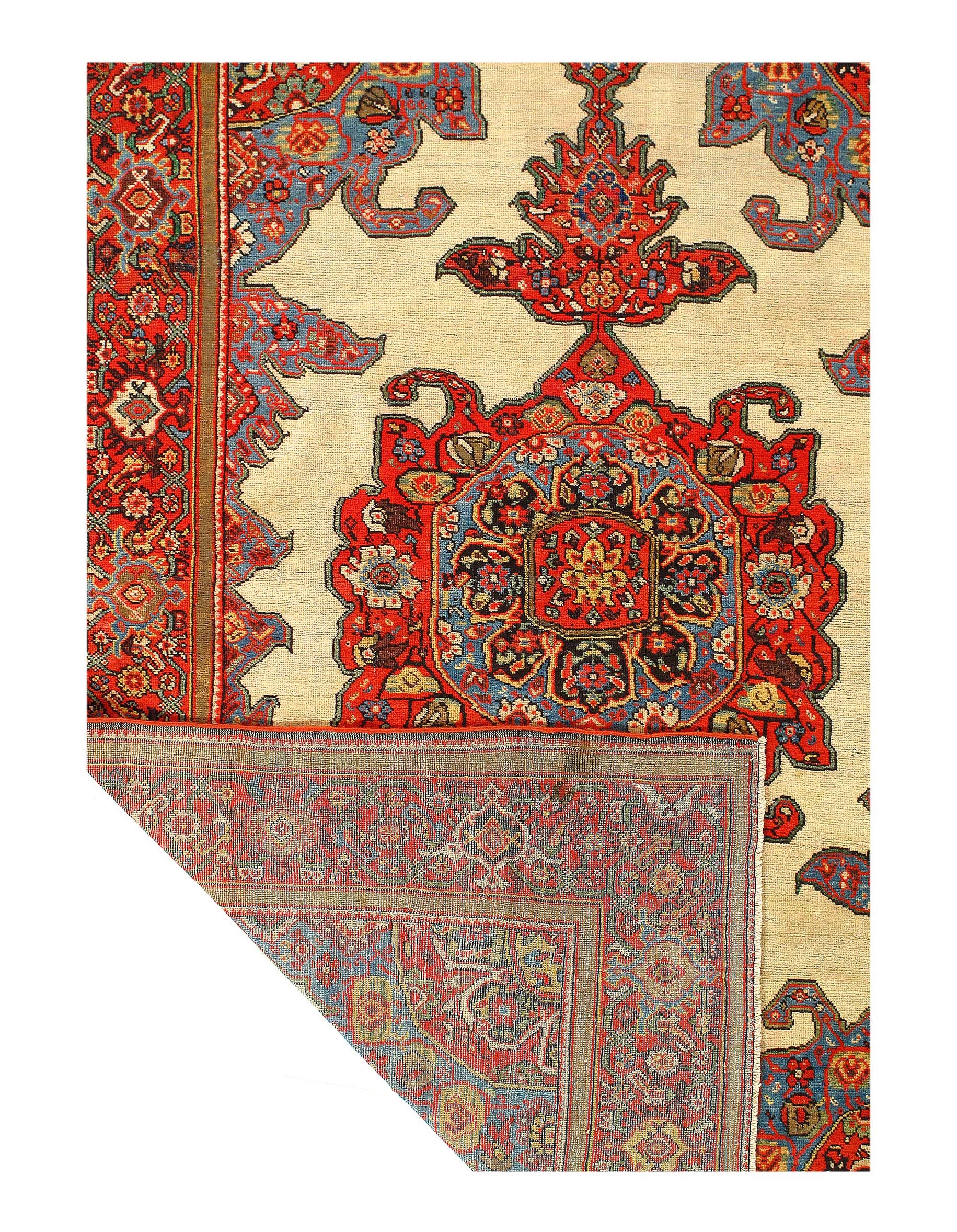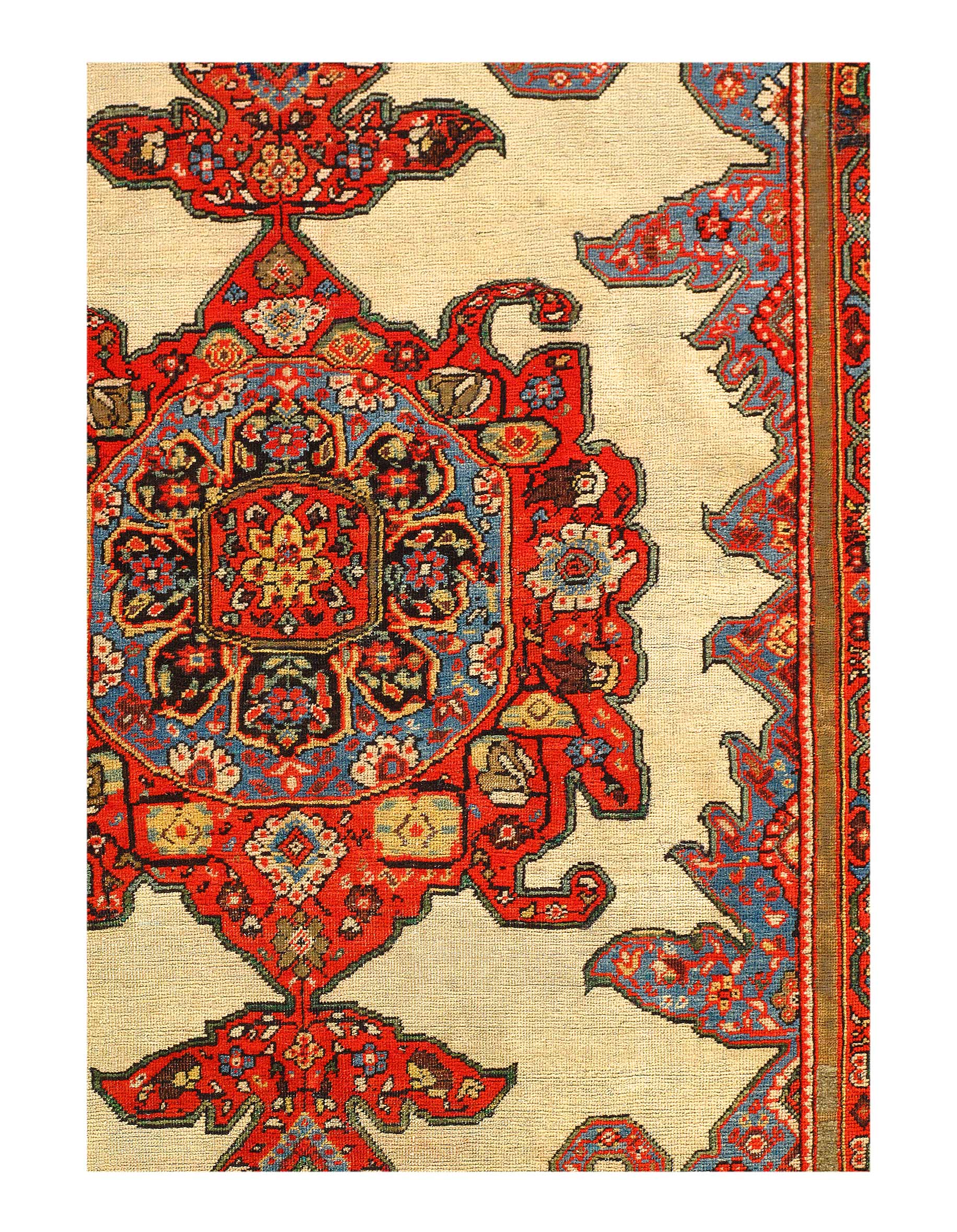 This antique carpet featured a beautifully intricate light Blue central medallion. This Persian rug’s diamond shaped central medallion is characterized by a fanciful pattern and lined with a thin thread of cream.