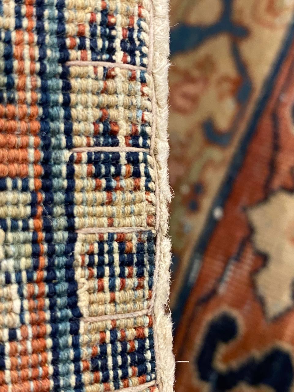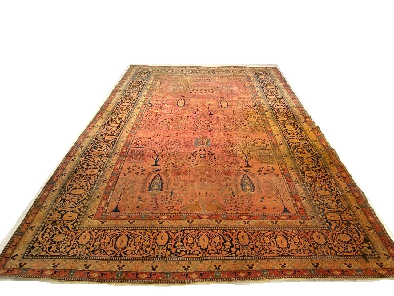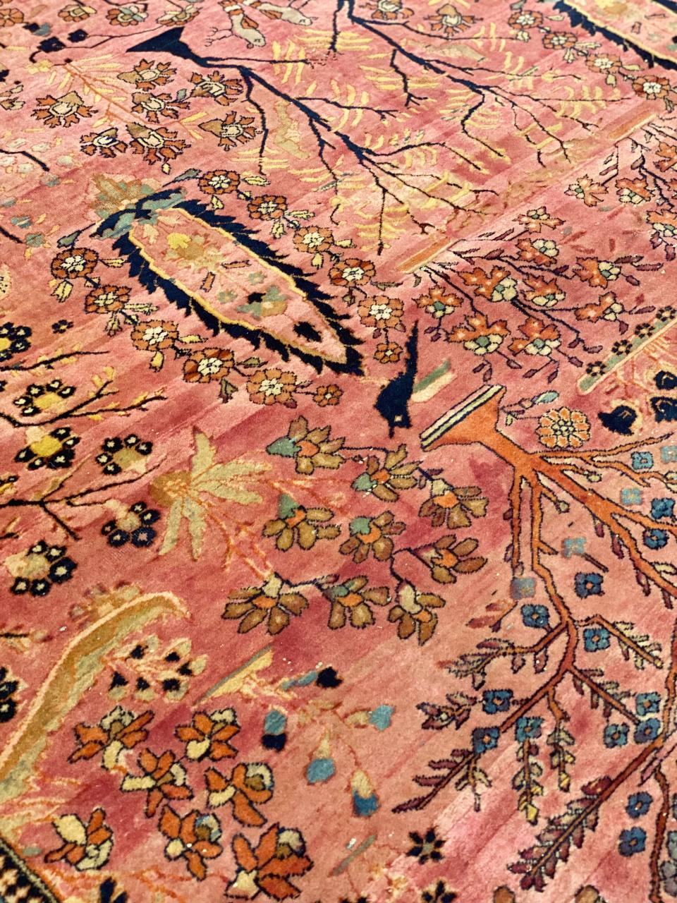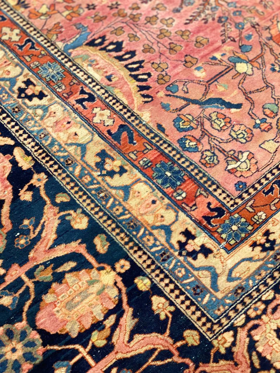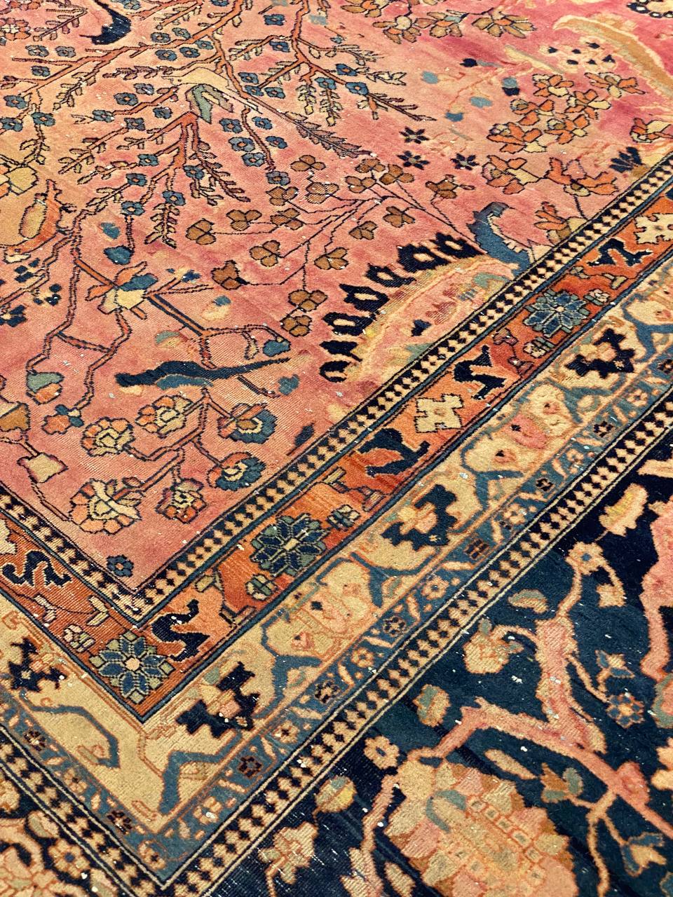 This magnificent oversized carpet is characterized by its multiple and elaborate surface layers. The outer border strand is decorated with a single file row of delicate florets in varying shades light blue, rust and neutrals.
