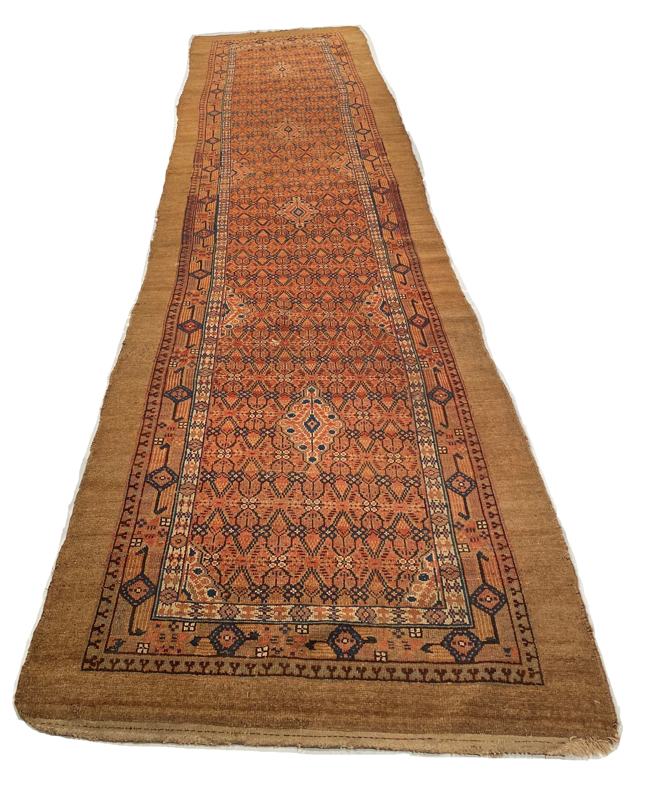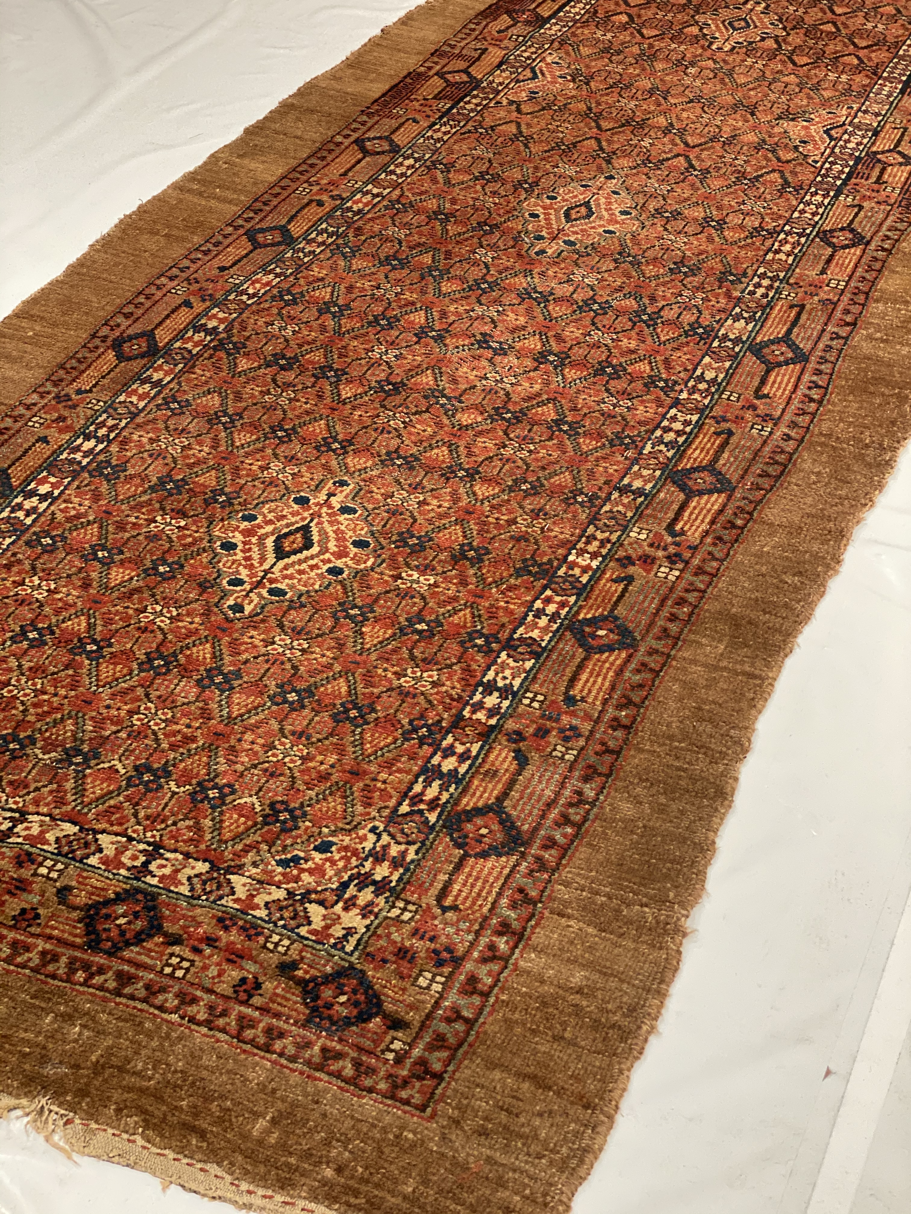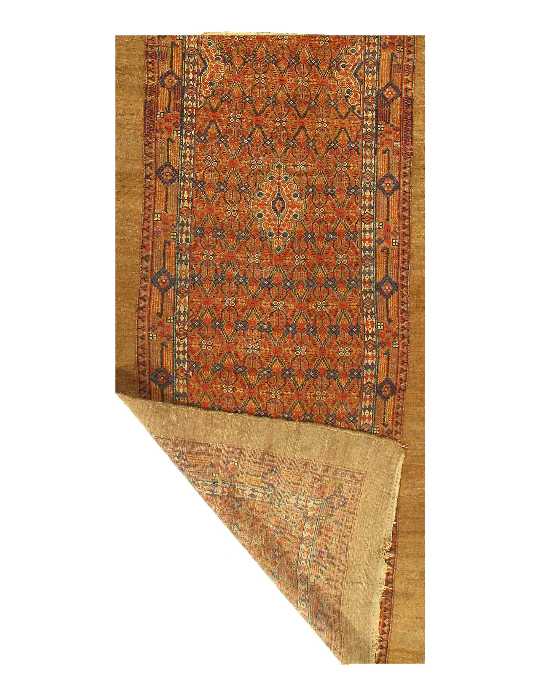 The central field of this beautiful antique runner rug displays a vibrant fusion of various geometric shapes. These tribal patterns are set against a bolder earthy reddish brown color. This created a beautiful juxtaposition and playfulness between the designs themselves and background.