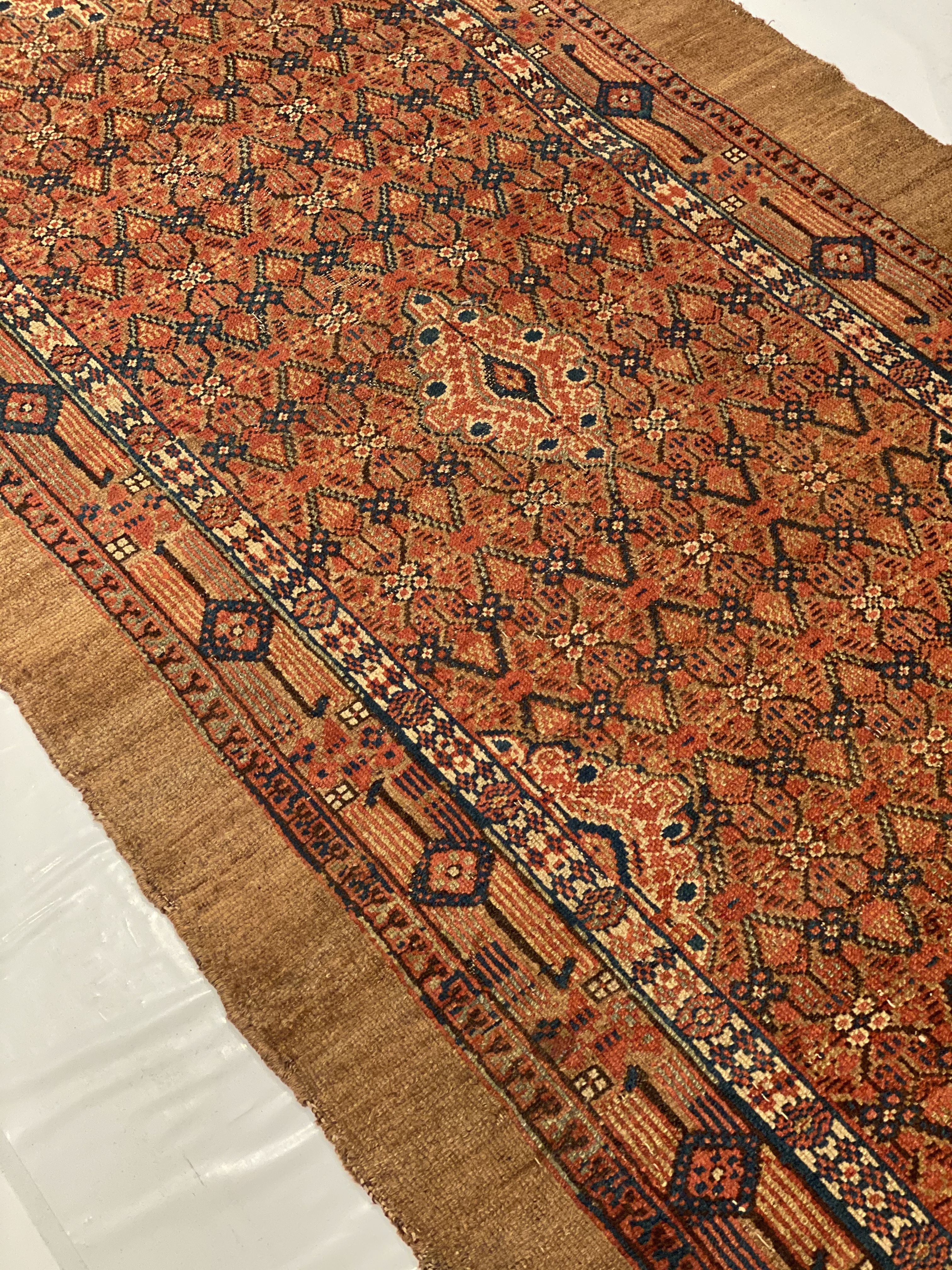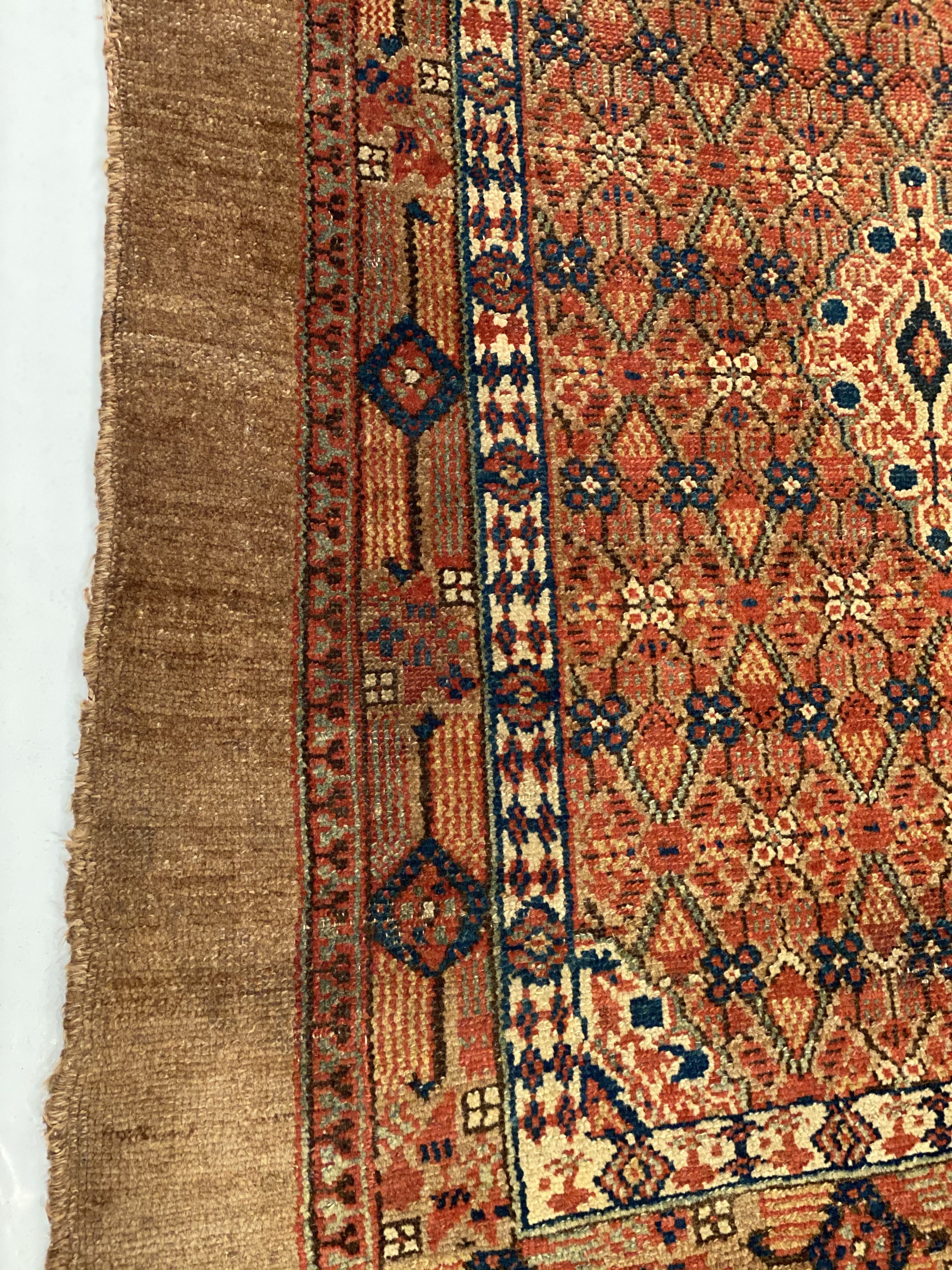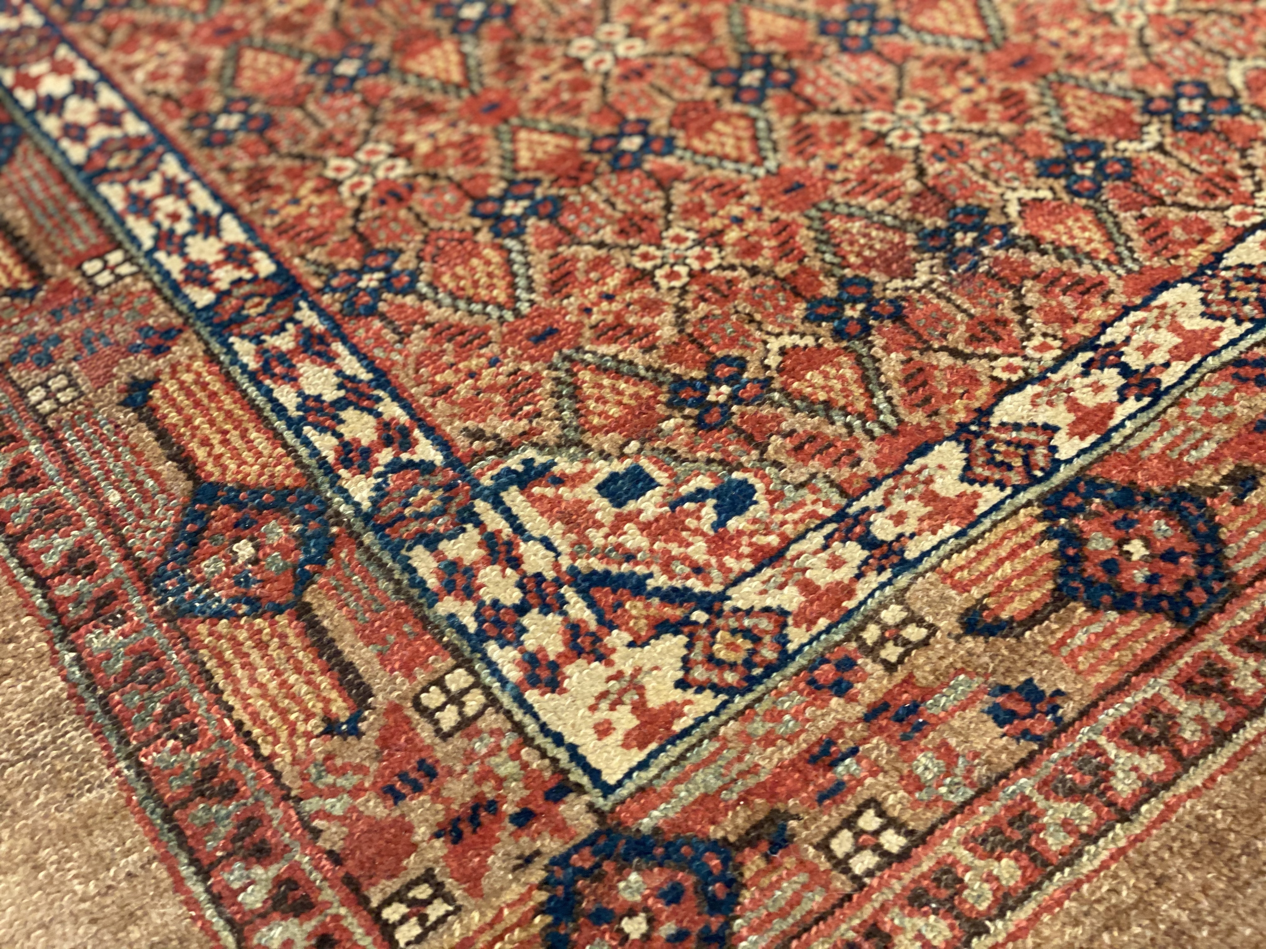 This elegant and tribal antique Persian Serab rug is a masterpiece of sophisticated splendor. Warm neutral tones of brown, camel, beige and rust ,