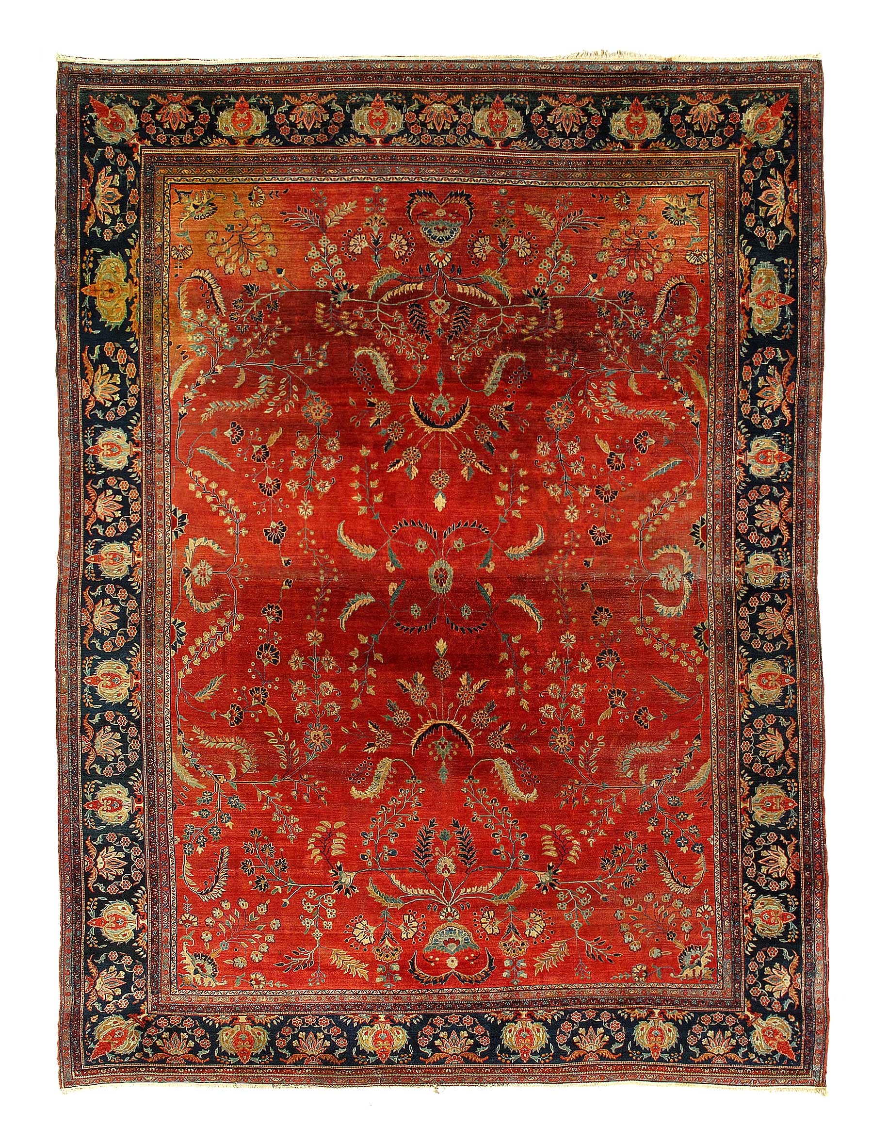 Beautiful Antique Rust Background Farhan Persian Rug D12095, Country of Origin / Rug Type: Persian Rug, Circa Date: 1900 – This beautiful antique Persian Sarouk Farahan rug features autumnal colors dominate the landscape, resulting in a brilliant display of color that seems almost nostalgic in its presentation. The warm colors invite the viewer to explore the Persian rug’s depths, and the clever use of dark and light contrasting around the borders establishes a clear grounding presence that helps define the appearance of the antique area rug as a whole. The largest border is surrounded on both sides by two thinner ones, which creates an even more refined arrangement, one that leads the viewer’s eyes effortlessly to the center of the antique Oriental rug, where the largest, “diamondesque” form at the center features a darker color palette to dominate the lighter landscape.