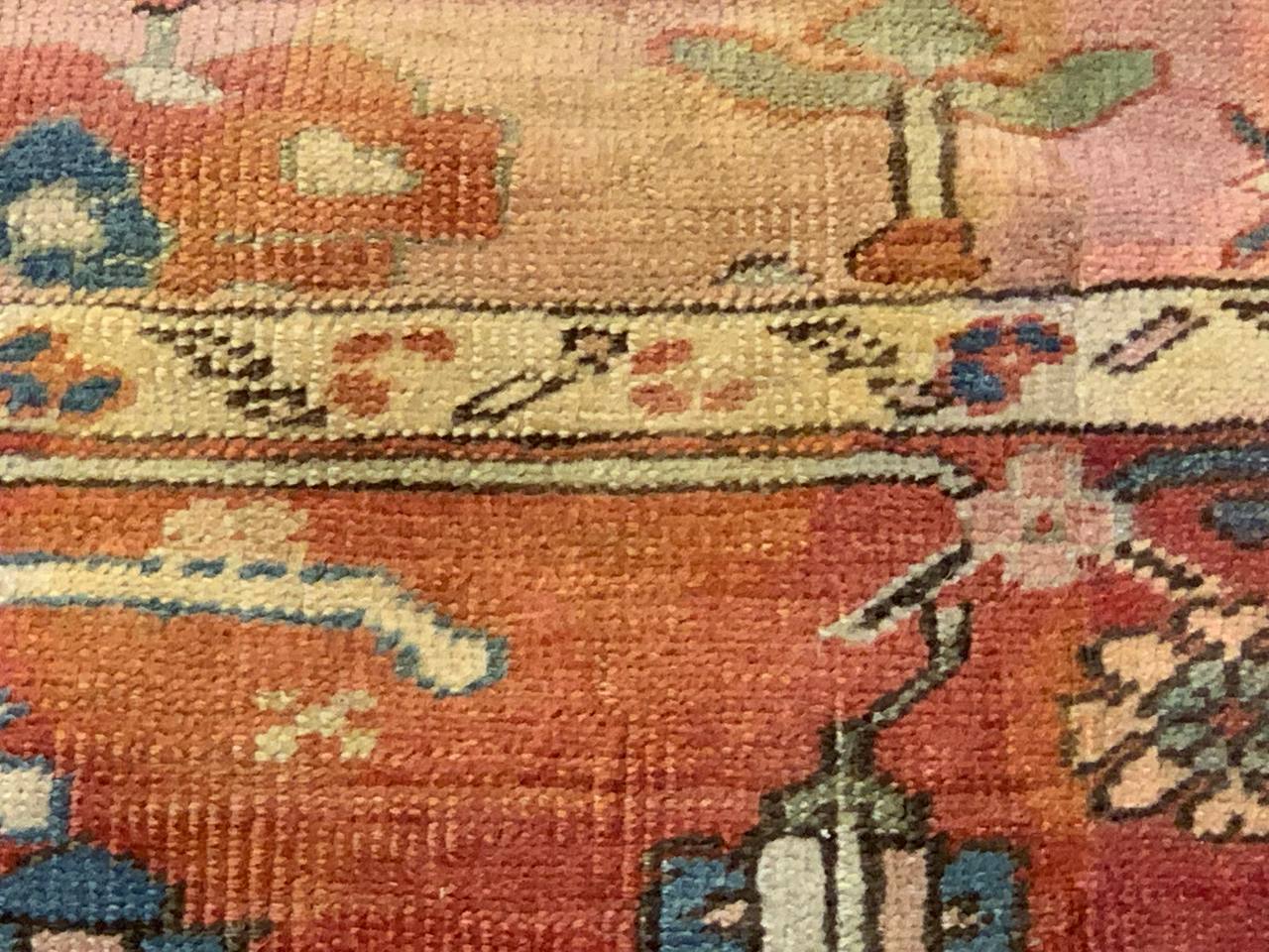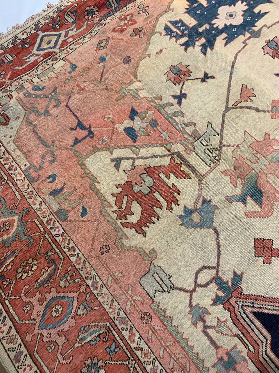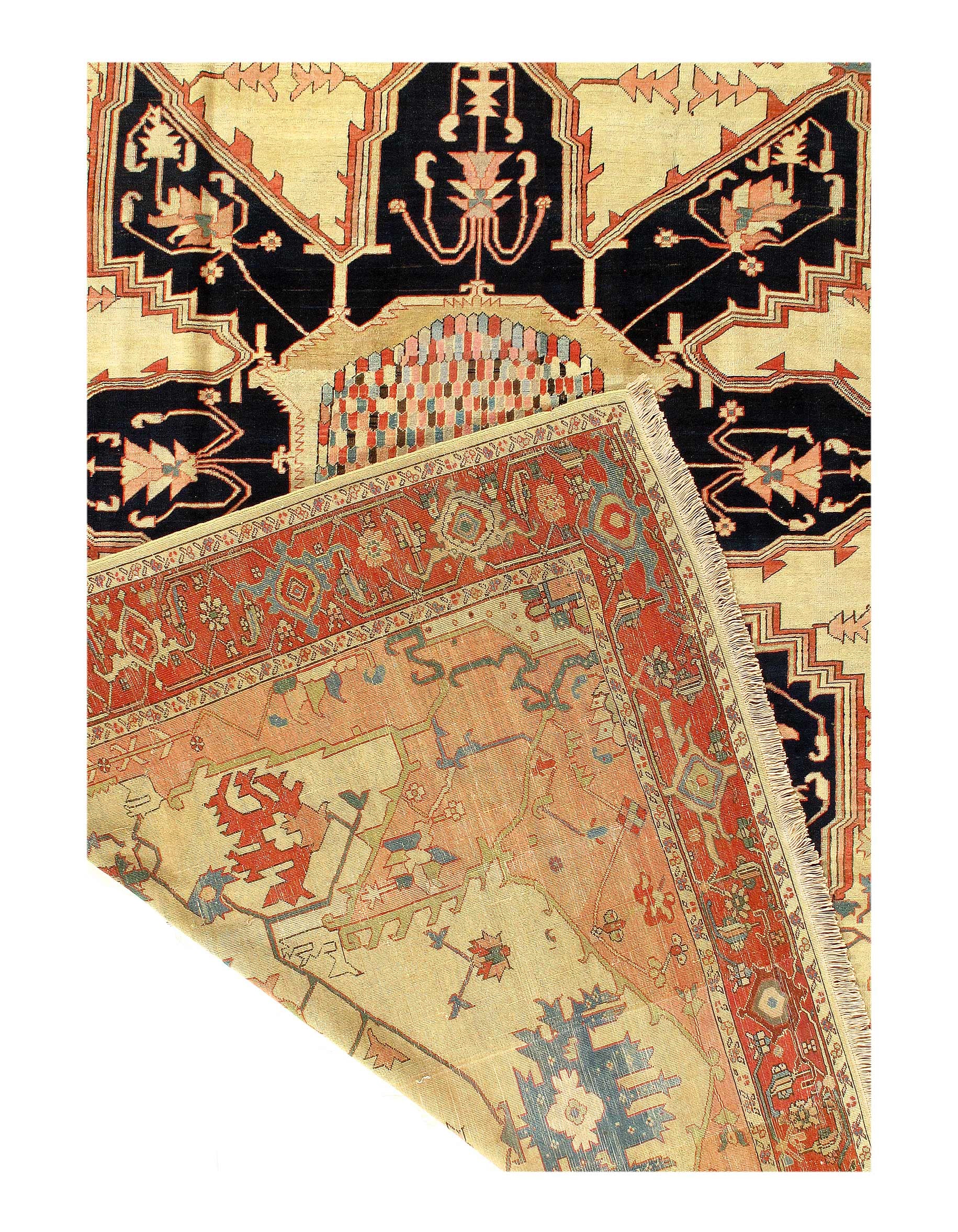 Large Size Antique Oriental Persian Serapi Rug, Country of Origin: Persia, Circa Date: Late 19th Century – This particular masterpiece is a large Persian Serapi rug. The extraordinarily bold yet delicate details of this elegant large size rug are simply exquisite. Floral ornaments dance, entwined with whimsical tendrils creating the ornate outer border. The intricate arrangement of flirtatious filigree and foliage continue in many subtle hues as the design flows freely toward the heart of this hand weaved antique treasure. A brilliant blocked inner border angels itself in contrast against the darker outlining borders beckoning you within its walls. The large size rug medallion radiates, encircled by an elaborate composition of delicate flowers and hearts surrounded by festive frondescence. Its rhythm is both pleasing to the eye and soothing to the senses. This antique Oriental rug is a breathtaking antique Persian Serapi rug that will continue to maintain its ancient status as an object of luxury, elegance, and refinement.