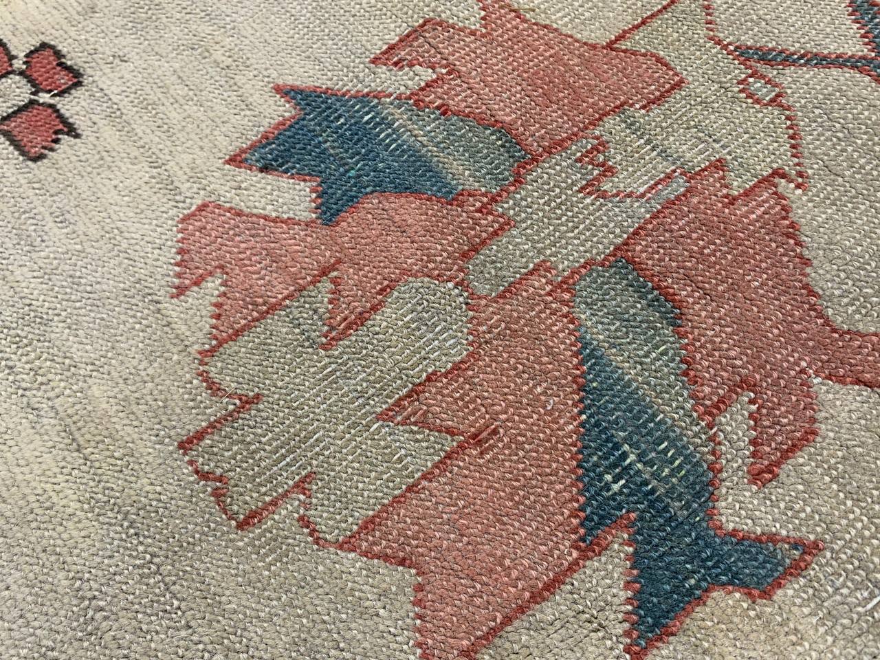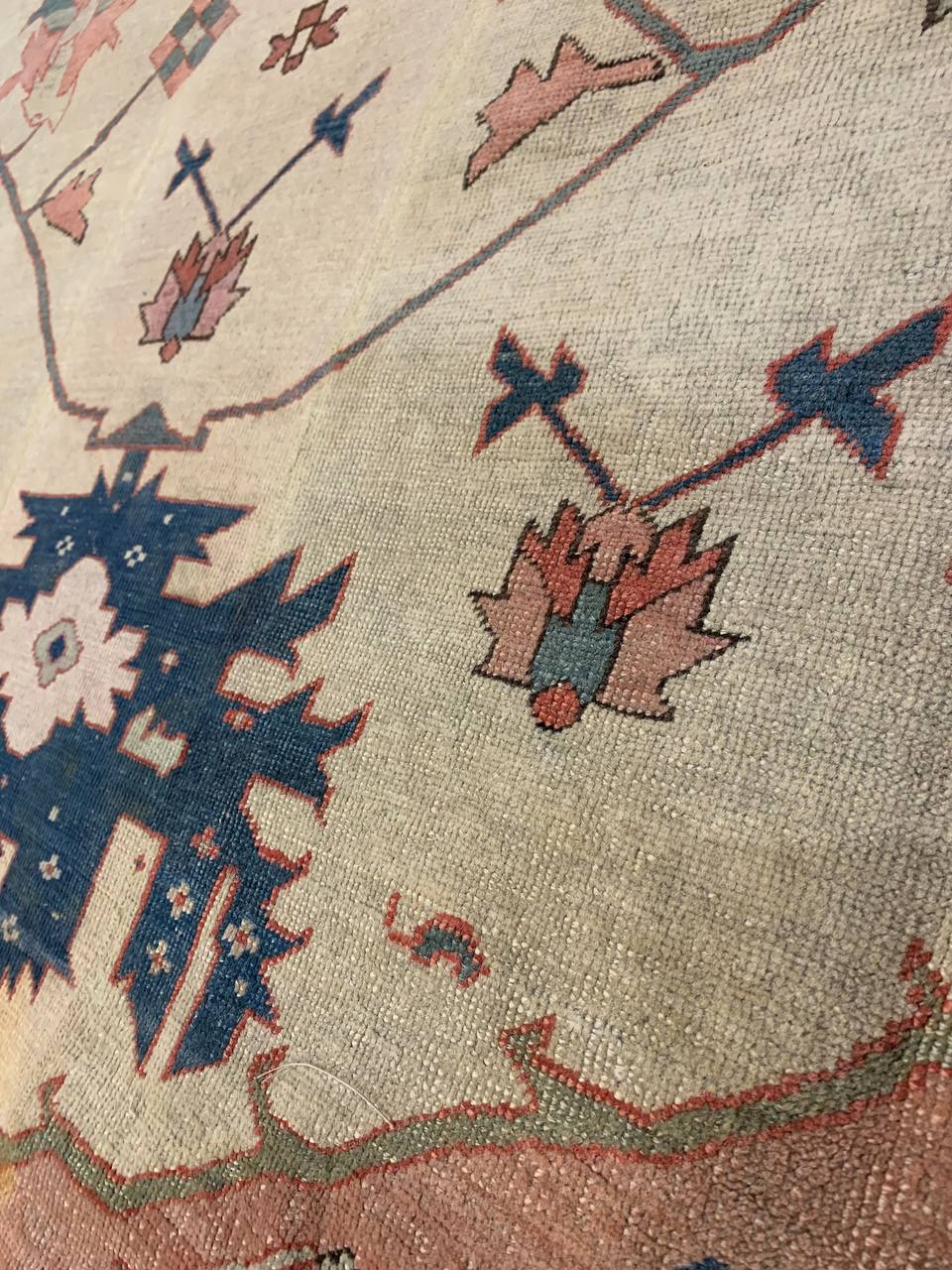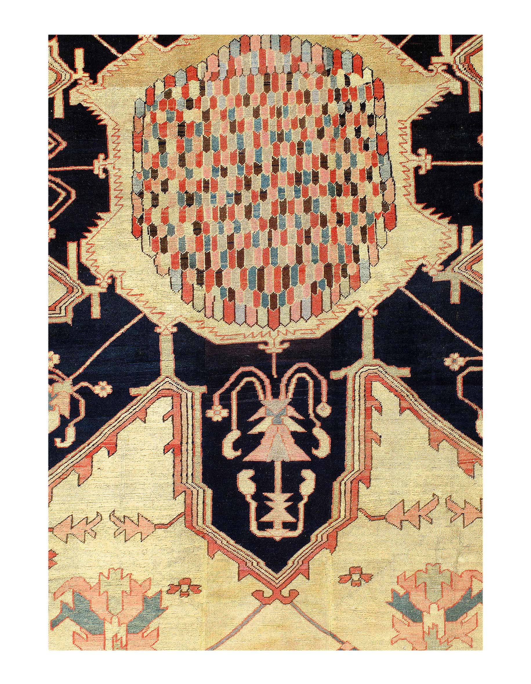 Large Size Antique Oriental Persian Serapi Rug, Country of Origin: Persia, Circa Date: Late 19th Century – This particular masterpiece is a large Persian Serapi rug. The extraordinarily bold yet delicate details of this elegant large size rug are simply exquisite. Floral ornaments dance, entwined with whimsical tendrils creating the ornate outer border. The intricate arrangement of flirtatious filigree and foliage continue in many subtle hues as the design flows freely toward the heart of this hand weaved antique treasure. A brilliant blocked inner border angels itself in contrast against the darker outlining borders beckoning you within its walls. The large size rug medallion radiates, encircled by an elaborate composition of delicate flowers and hearts surrounded by festive frondescence. Its rhythm is both pleasing to the eye and soothing to the senses. This antique Oriental rug is a breathtaking antique Persian Serapi rug that will continue to maintain its ancient status as an object of luxury, elegance, and refinement.