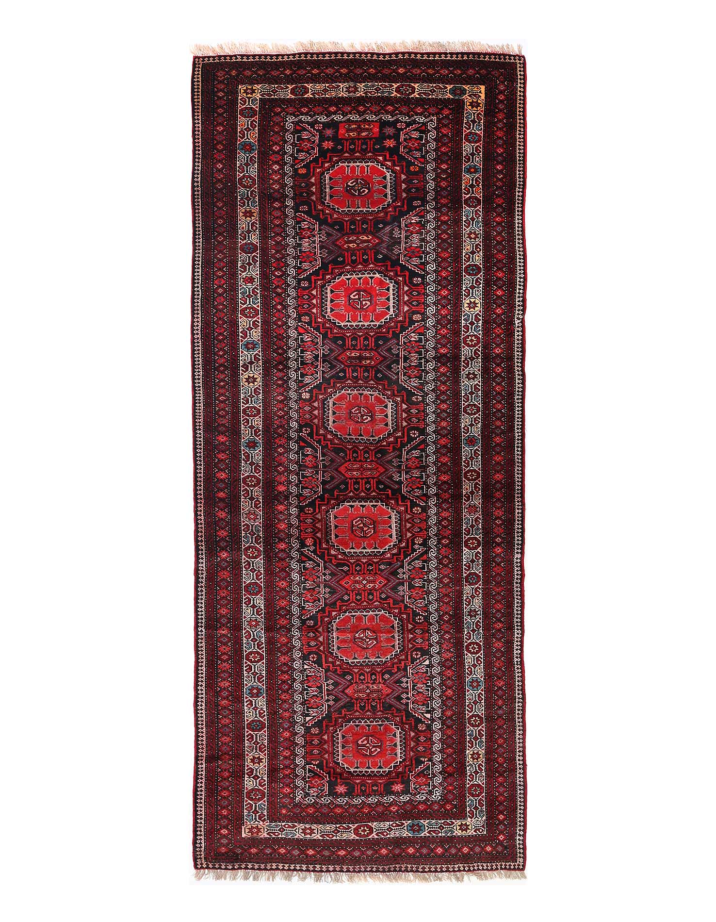 The Baluchi rugs woven in Iran have very geometric and intricate designs, borrowing largely from Turkoman tribal influences Traditional, Tribal style rug with Cream, Dark Navy, Red accent colors Imported from Iran and crafted using the finest weaving techniques Hand-knotted and constructed from 100% Wool with 100% Cotton foundation 3-Feet 7-Inch by 9-Feet 3-Inch