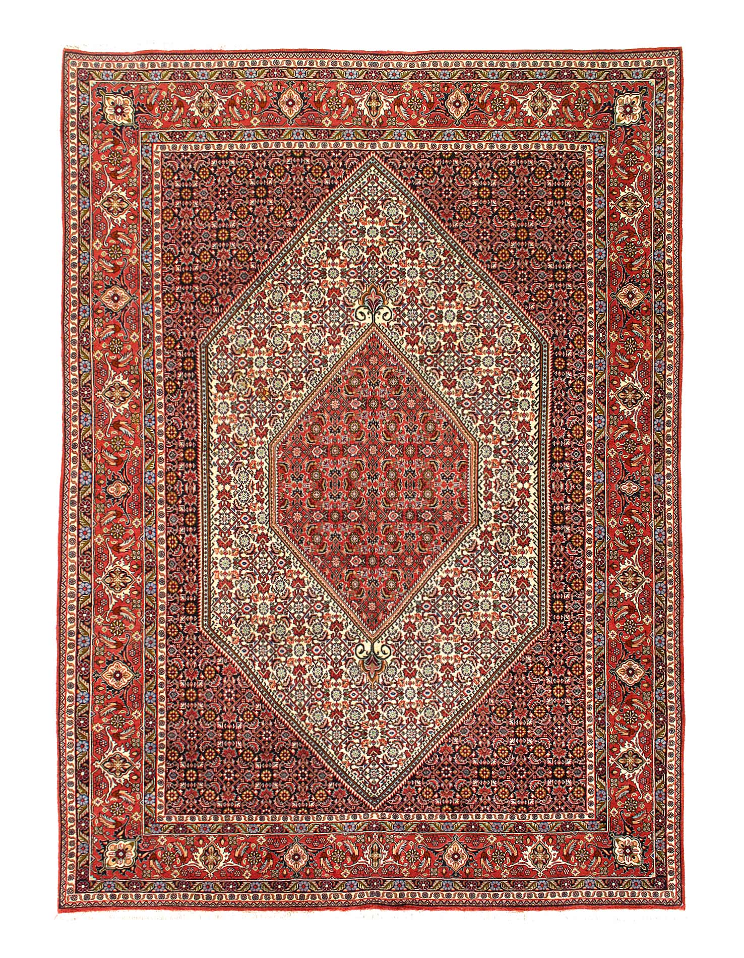 Bidjar is a town in Persian Kurdistan located in north-west Persia. The Bidjar name is also used to describe the antique rugs that were produced in the many villages in the surrounding vicinity. The Bidjar is noted as being the stiffest carpet made; they are very heavy in relation to their size, and very thick and durable. All of the knots are symmetrical and the rows are beaten down during the weaving process producing a dense compact fabric. Given their thickness and construction Bidjar rugs can be difficult to fold. The many designs depict the Kurdish influence of the area and often floral and classical geometric motifs are employed as well as the use of large, whimsical medallion designs. The color palate is rich and jewel toned making the Bidjar a highly desirable rug sought after by designers.