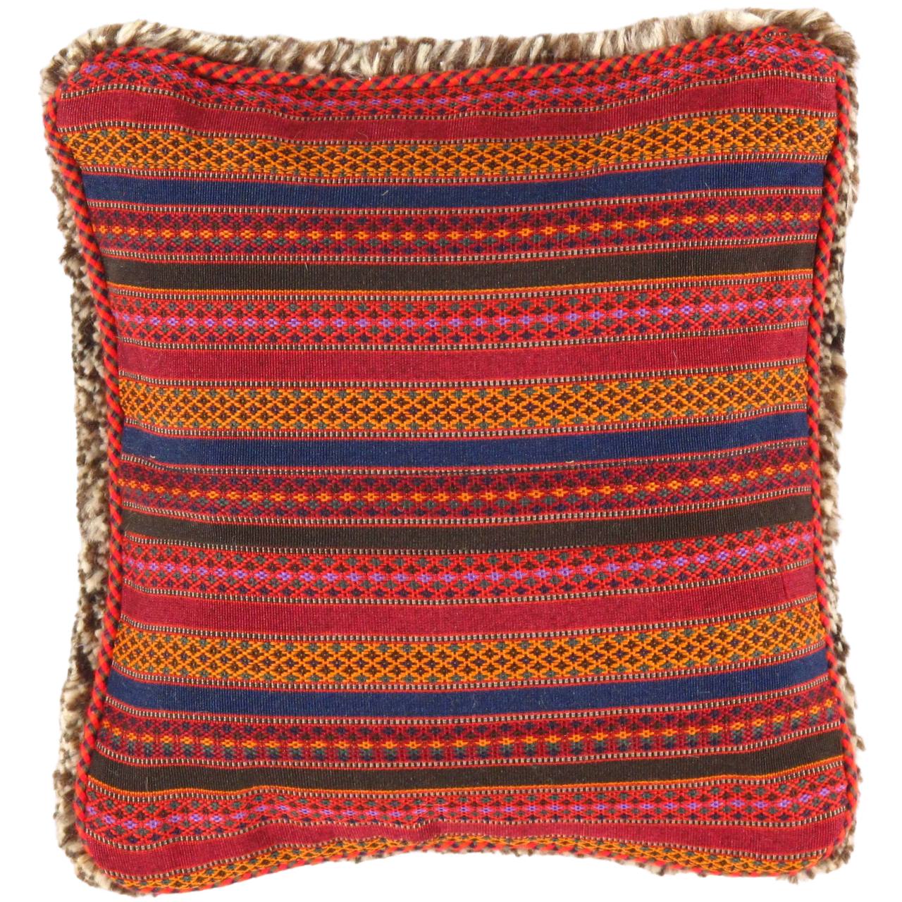The word “Gabbeh” literally translates to “in the rough,” and it is an accurate description of this style of Persian rug. Gabbeh carpets are woven on makeshift ground looms constructed both of materials that are kept and hauled for long distances by the nomadic tribel, and also of materials that are found at each site where the tribe sets up camp. Due to the fact that part of the loom must be found at each site, a wide variety is introduced. Thus, these rugs are usually somewhat irregular in shape. But, for what they lack in perfectly uniform shape they more than make up for in character, durability and uniqueness.This Gabbeh pillow is made of high-quality LAMBS WOOL The piece was crafted with good workmanship.
