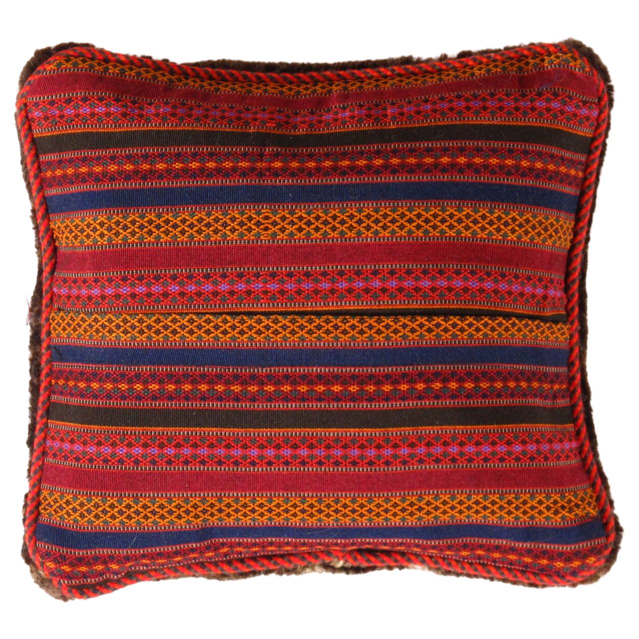 The word “Gabbeh” literally translates to “in the rough,” and it is an accurate description of this style of Persian rug. Gabbeh carpets are woven on makeshift ground looms constructed both of materials that are kept and hauled for long distances by the nomadic tribel, and also of materials that are found at each site where the tribe sets up camp. Due to the fact that part of the loom must be found at each site, a wide variety is introduced. Thus, these rugs are usually somewhat irregular in shape. But, for what they lack in perfectly uniform shape they more than make up for in character, durability and uniqueness.This Gabbeh pillow is made of high-quality LAMBS WOOL The piece was crafted with good workmanship.