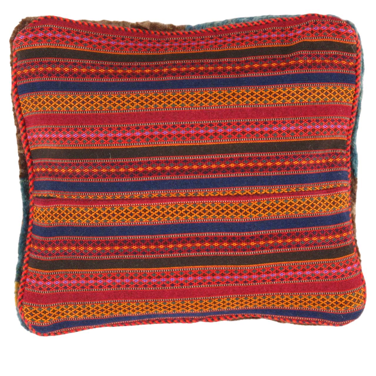 The word “Gabbeh” literally translates to “in the rough,” and it is an accurate description of this style of Persian rug. Gabbeh carpets are woven on makeshift ground looms constructed both of materials that are kept and hauled for long distances by the nomadic tribel, and also of materials that are found at each site where the tribe sets up camp. Due to the fact that part of the loom must be found at each site, a wide variety is introduced. Thus, these rugs are usually somewhat irregular in shape. But, for what they lack in perfectly uniform shape they more than make up for in character, durability and uniqueness.This Gabbeh pillow is made of high-quality LAMBS WOOL The piece was crafted with good workmanship.