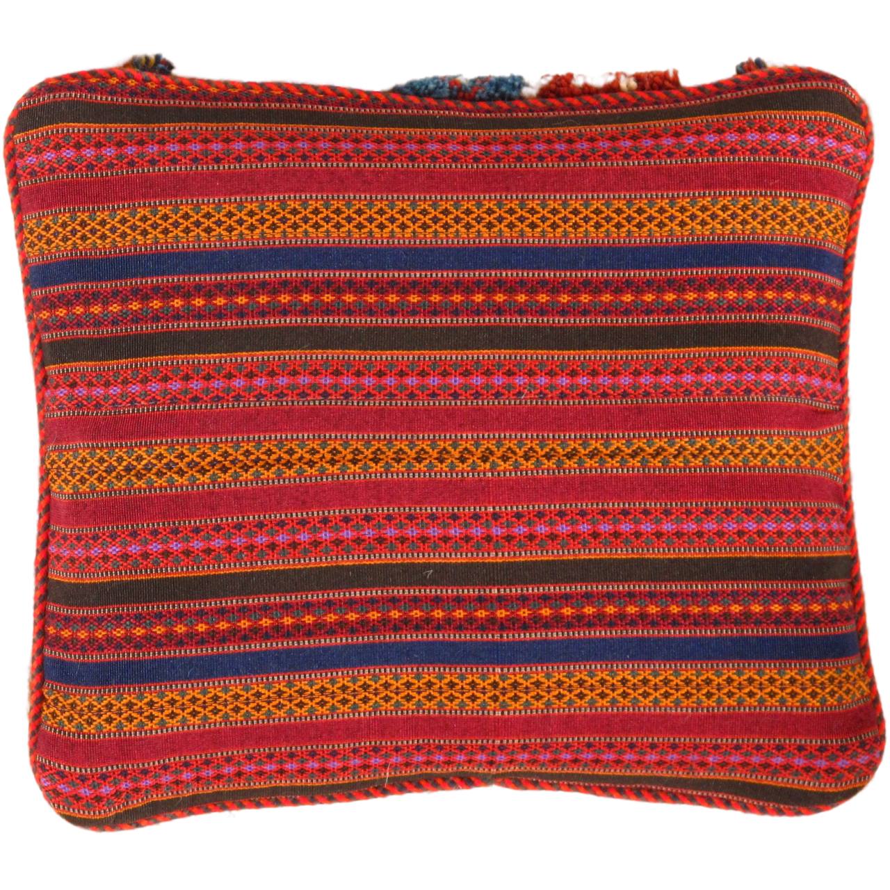 The word “Gabbeh” literally translates to “in the rough,” and it is an accurate description of this style of Persian rug. Gabbeh carpets are woven on makeshift ground looms constructed both of materials that are kept and hauled for long distances by the nomadic tribel, and also of materials that are found at each site where the tribe sets up camp. Due to the fact that part of the loom must be found at each site, a wide variety is introduced. Thus, these rugs are usually somewhat irregular in shape. But, for what they lack in perfectly uniform shape they more than make up for in character, durability and uniqueness.This Gabbeh pillow is made of high-quality LAMBS WOOL The piece was crafted with good workmanship.