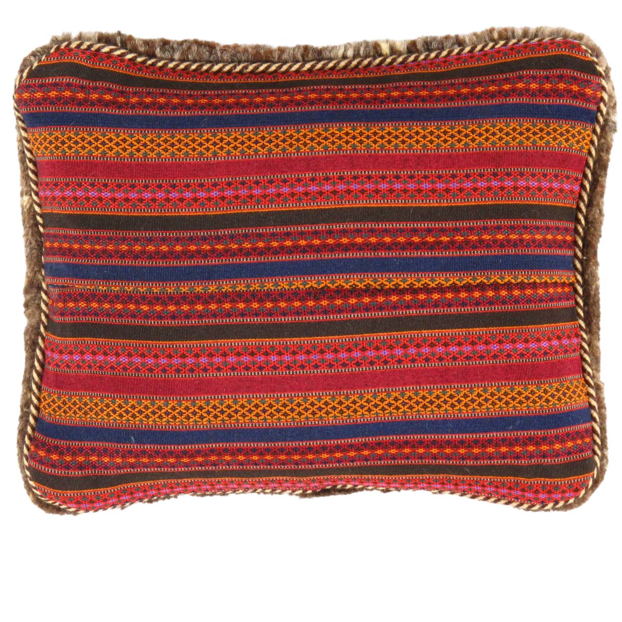 The word “Gabbeh” literally translates to “in the rough,” and it is an accurate description of this style of Persian rug. Gabbeh carpets are woven on makeshift ground looms constructed both of materials that are kept and hauled for long distances by the nomadic tribel, and also of materials that are found at each site where the tribe sets up camp. Due to the fact that part of the loom must be found at each site, a wide variety is introduced. Thus, these rugs are usually somewhat irregular in shape. But, for what they lack in perfectly uniform shape they more than make up for in character, durability and uniqueness.This Gabbeh pillow is made of high-quality LAMBS WOOL The piece was crafted with good workmanship.