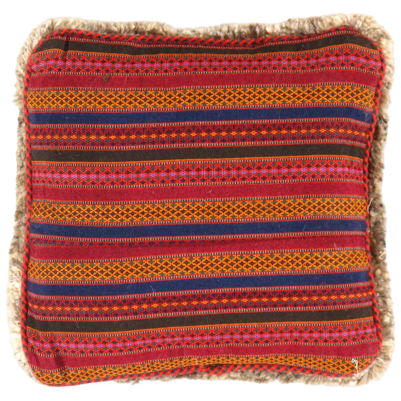 The word “Gabbeh” literally translates to “in the rough,” and it is an accurate description of this style of Persian rug. Gabbeh carpets are woven on makeshift ground looms constructed both of materials that are kept and hauled for long distances by the nomadic tribel, and also of materials that are found at each site where the tribe sets up camp. Due to the fact that part of the loom must be found at each site, a wide variety is introduced. Thus, these rugs are usually somewhat irregular in shape. But, for what they lack in perfectly uniform shape they more than make up for in character, durability and uniqueness.This Gabbeh pillow is made of high-quality LAMBS WOOL The piece was crafted with good workmanship.