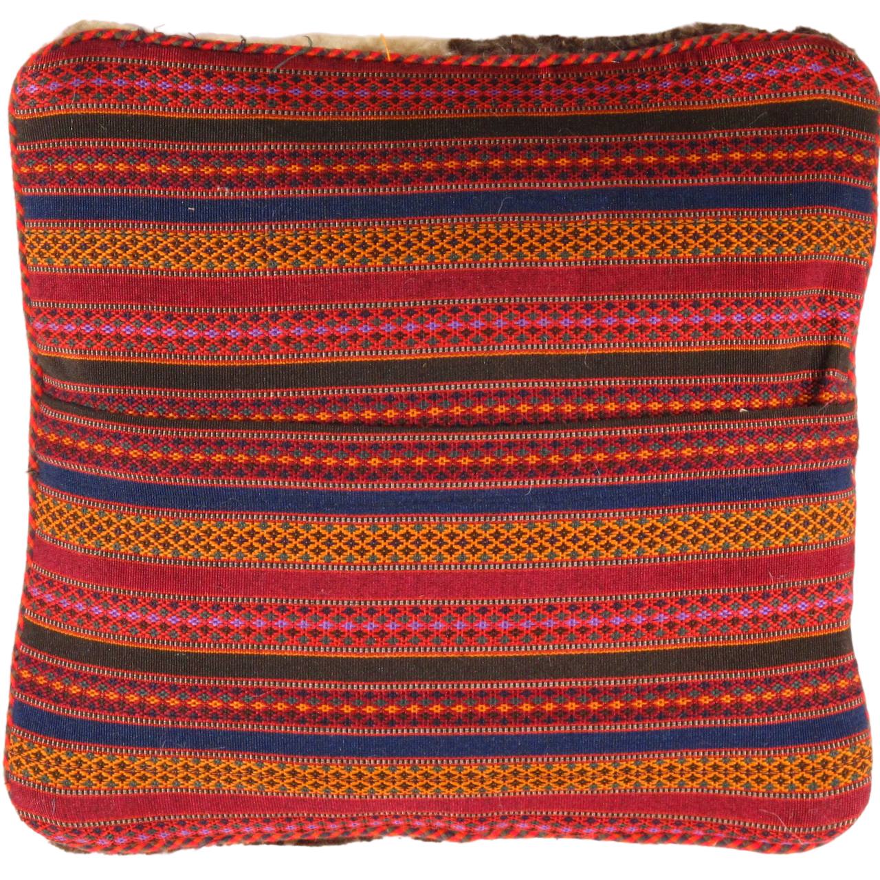 The word “Gabbeh” literally translates to “in the rough,” and it is an accurate description of this style of Persian rug. Gabbeh carpets are woven on makeshift ground looms constructed both of materials that are kept and hauled for long distances by the nomadic tribel, and also of materials that are found at each site where the tribe sets up camp. Due to the fact that part of the loom must be found at each site, a wide variety is introduced. Thus, these rugs are usually somewhat irregular in shape. But, for what they lack in perfectly uniform shape they more than make up for in character, durability and uniqueness.This Gabbeh pillow is made of high-quality LAMBS WOOL The piece was crafted with good workmanship.