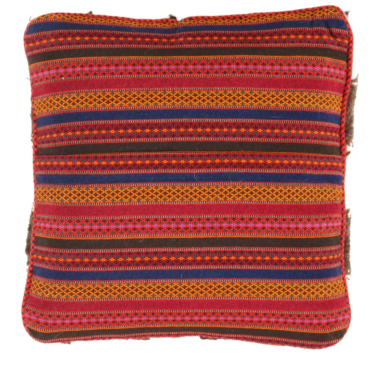 The word “Gabbeh” literally translates to “in the rough,” and it is an accurate description of this style of Persian rug. Gabbeh carpets are woven on makeshift ground looms constructed both of materials that are kept and hauled for long distances by the nomadic tribel, and also of materials that are found at each site where the tribe sets up camp. Due to the fact that part of the loom must be found at each site, a wide variety is introduced. Thus, these rugs are usually somewhat irregular in shape. But, for what they lack in perfectly uniform shape they more than make up for in character, durability and uniqueness.This Gabbeh pillow is made of high-quality LAMBS WOOL The piece was crafted with good workmanship.