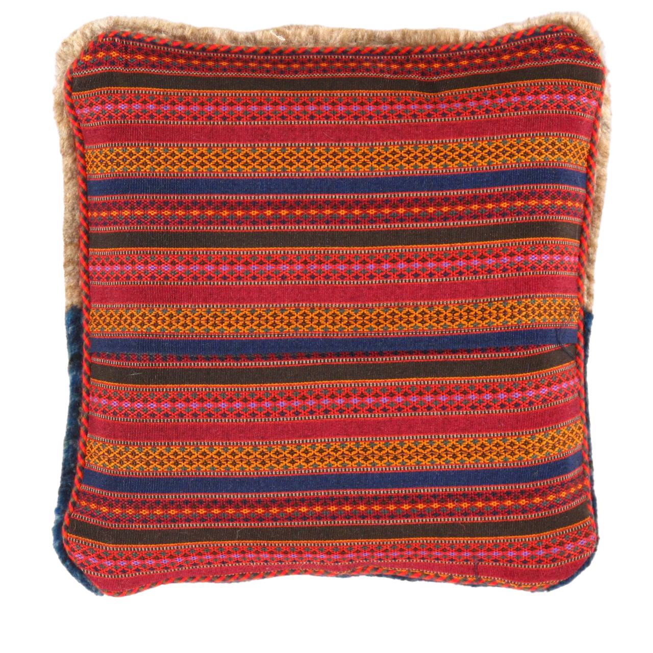 The word “Gabbeh” literally translates to “in the rough,” and it is an accurate description of this style of Persian rug. Gabbeh carpets are woven on makeshift ground looms constructed both of materials that are kept and hauled for long distances by the nomadic tribel, and also of materials that are found at each site where the tribe sets up camp. Due to the fact that part of the loom must be found at each site, a wide variety is introduced. Thus, these rugs are usually somewhat irregular in shape. But, for what they lack in perfectly uniform shape they more than make up for in character, durability and uniqueness.This Gabbeh pillow is made of high-quality LAMBS WOOL The piece was crafted with good workmanship.