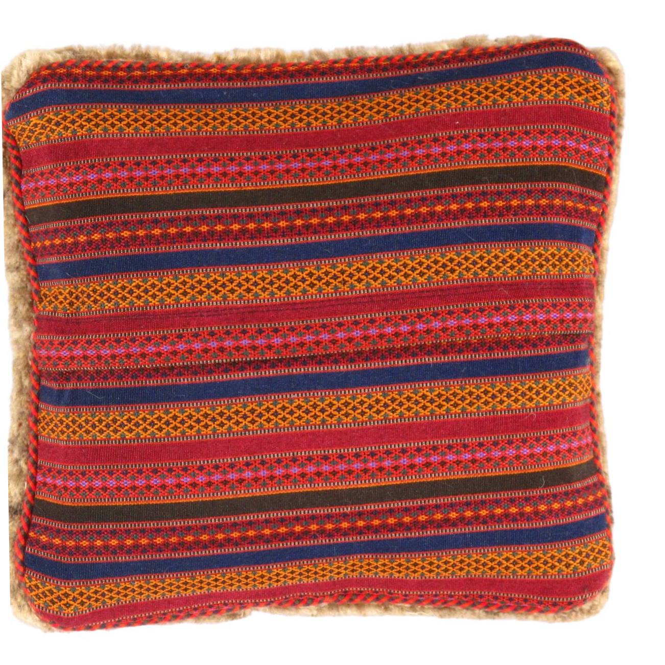 The word “Gabbeh” literally translates to “in the rough,” and it is an accurate description of this style of Persian rug. Gabbeh carpets are woven on makeshift ground looms constructed both of materials that are kept and hauled for long distances by the nomadic tribel, and also of materials that are found at each site where the tribe sets up camp. Due to the fact that part of the loom must be found at each site, a wide variety is introduced. Thus, these rugs are usually somewhat irregular in shape. But, for what they lack in perfectly uniform shape they more than make up for in character, durability and uniqueness.This Gabbeh pillow is made of high-quality LAMBS WOOL The piece was crafted with good workmanship.
