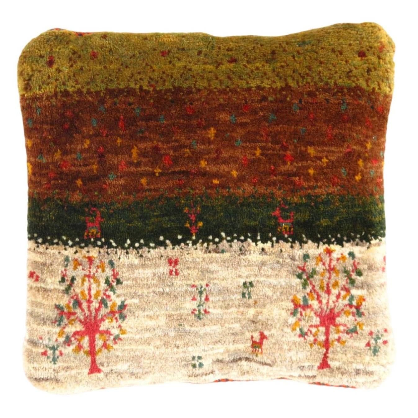 The word “Gabbeh” literally translates to “in the rough,” and it is an accurate description of this style of Persian rug. Gabbeh carpets are woven on makeshift ground looms constructed both of materials that are kept and hauled for long distances by the nomadic tribel, and also of materials that are found at each site where the tribe sets up camp. Due to the fact that part of the loom must be found at each site, a wide variety is introduced. Thus, these rugs are usually somewhat irregular in shape. But, for what they lack in perfectly uniform shape they more than make up for in character, durability and uniqueness.This Gabbeh pillow is made of high-quality LAMBS WOOL The piece was crafted with good workmanship.