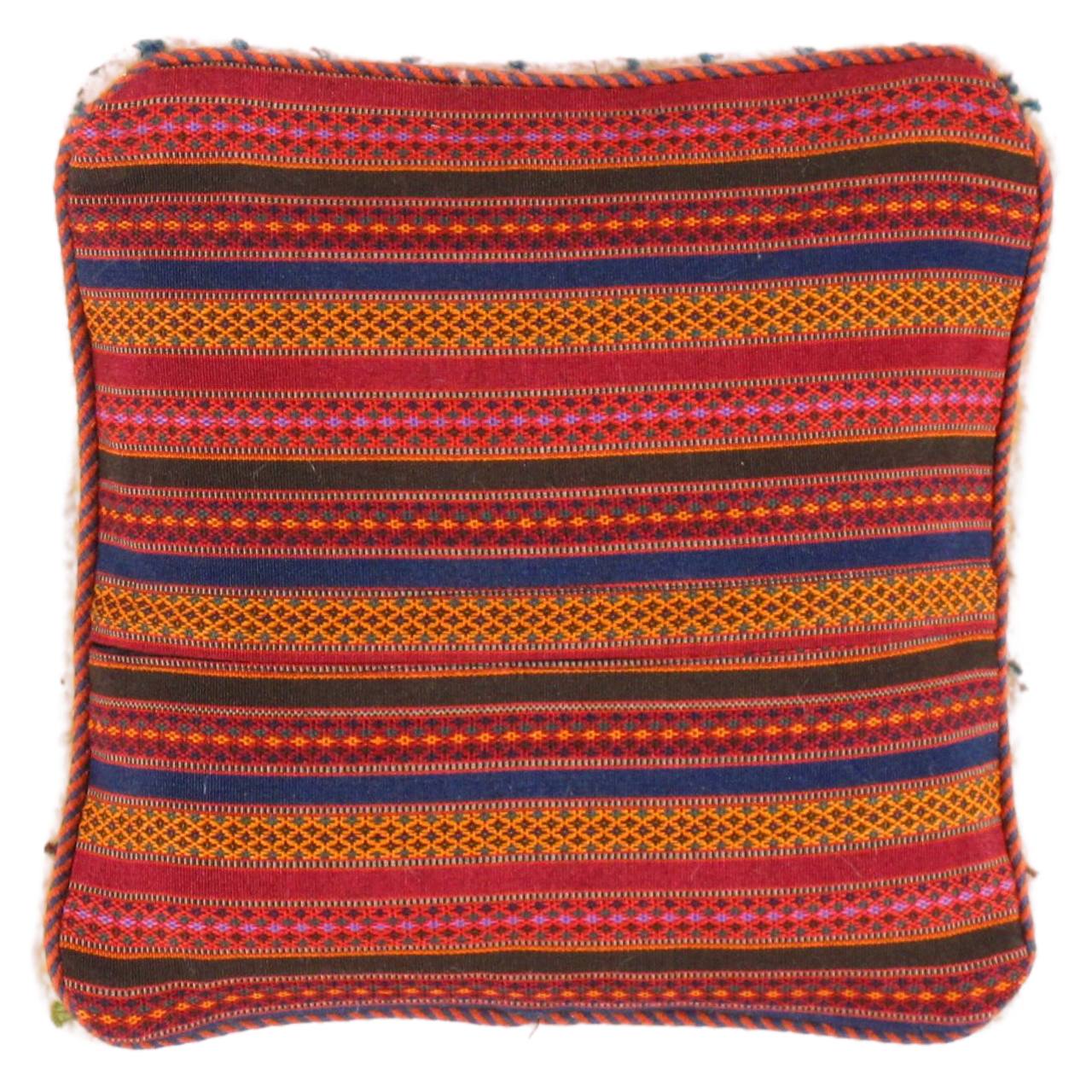 The word “Gabbeh” literally translates to “in the rough,” and it is an accurate description of this style of Persian rug. Gabbeh carpets are woven on makeshift ground looms constructed both of materials that are kept and hauled for long distances by the nomadic tribel, and also of materials that are found at each site where the tribe sets up camp. Due to the fact that part of the loom must be found at each site, a wide variety is introduced. Thus, these rugs are usually somewhat irregular in shape. But, for what they lack in perfectly uniform shape they more than make up for in character, durability and uniqueness.This Gabbeh pillow is made of high-quality LAMBS WOOL The piece was crafted with good workmanship.
