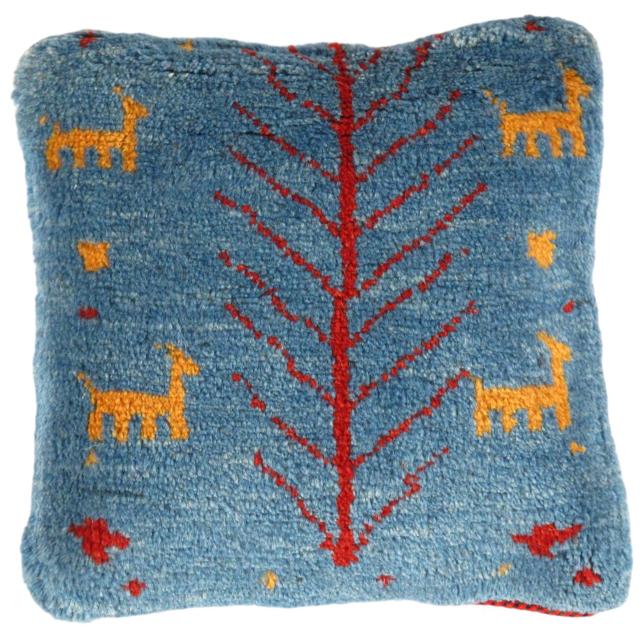 The word “Gabbeh” literally translates to “in the rough,” and it is an accurate description of this style of Persian rug. Gabbeh carpets are woven on makeshift ground looms constructed both of materials that are kept and hauled for long distances by the nomadic tribel, and also of materials that are found at each site where the tribe sets up camp. Due to the fact that part of the loom must be found at each site, a wide variety is introduced. Thus, these rugs are usually somewhat irregular in shape. But, for what they lack in perfectly uniform shape they more than make up for in character, durability and uniqueness.This Gabbeh pillow is made of high-quality LAMBS WOOL The piece was crafted with good workmanship.