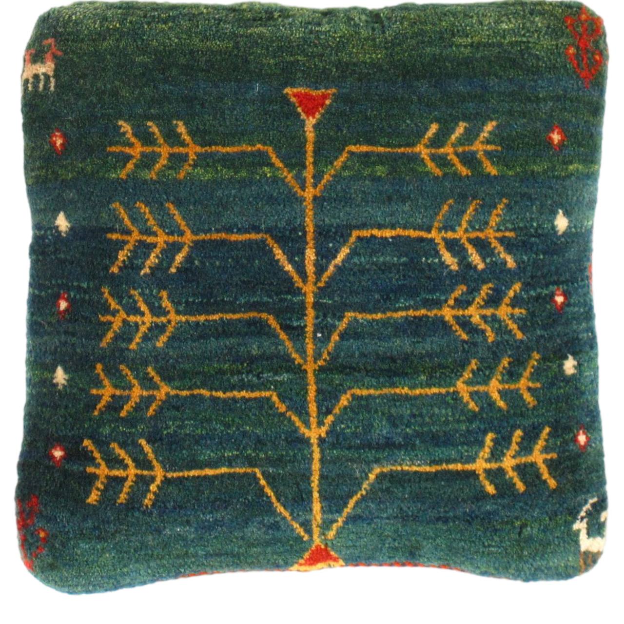 The word “Gabbeh” literally translates to “in the rough,” and it is an accurate description of this style of Persian rug. Gabbeh carpets are woven on makeshift ground looms constructed both of materials that are kept and hauled for long distances by the nomadic tribel, and also of materials that are found at each site where the tribe sets up camp. Due to the fact that part of the loom must be found at each site, a wide variety is introduced. Thus, these rugs are usually somewhat irregular in shape. But, for what they lack in perfectly uniform shape they more than make up for in character, durability and uniqueness.This Gabbeh pillow is made of high-quality LAMBS WOOL The piece was crafted with good workmanship.