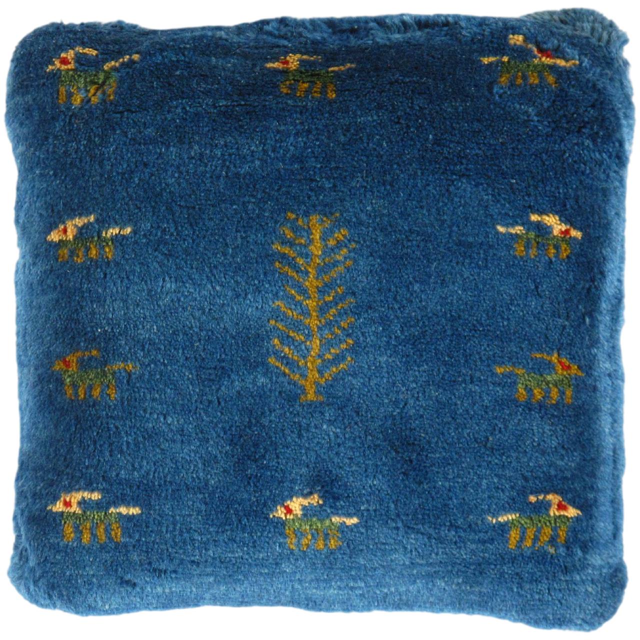 The word “Gabbeh” literally translates to “in the rough,” and it is an accurate description of this style of Persian rug. Gabbeh carpets are woven on makeshift ground looms constructed both of materials that are kept and hauled for long distances by the nomadic tribel, and also of materials that are found at each site where the tribe sets up camp. Due to the fact that part of the loom must be found at each site, a wide variety is introduced. Thus, these rugs are usually somewhat irregular in shape. But, for what they lack in perfectly uniform shape they more than make up for in character, durability and uniqueness.This Gabbeh pillow is made of high-quality LAMBS WOOL The piece was crafted with good workmanship.