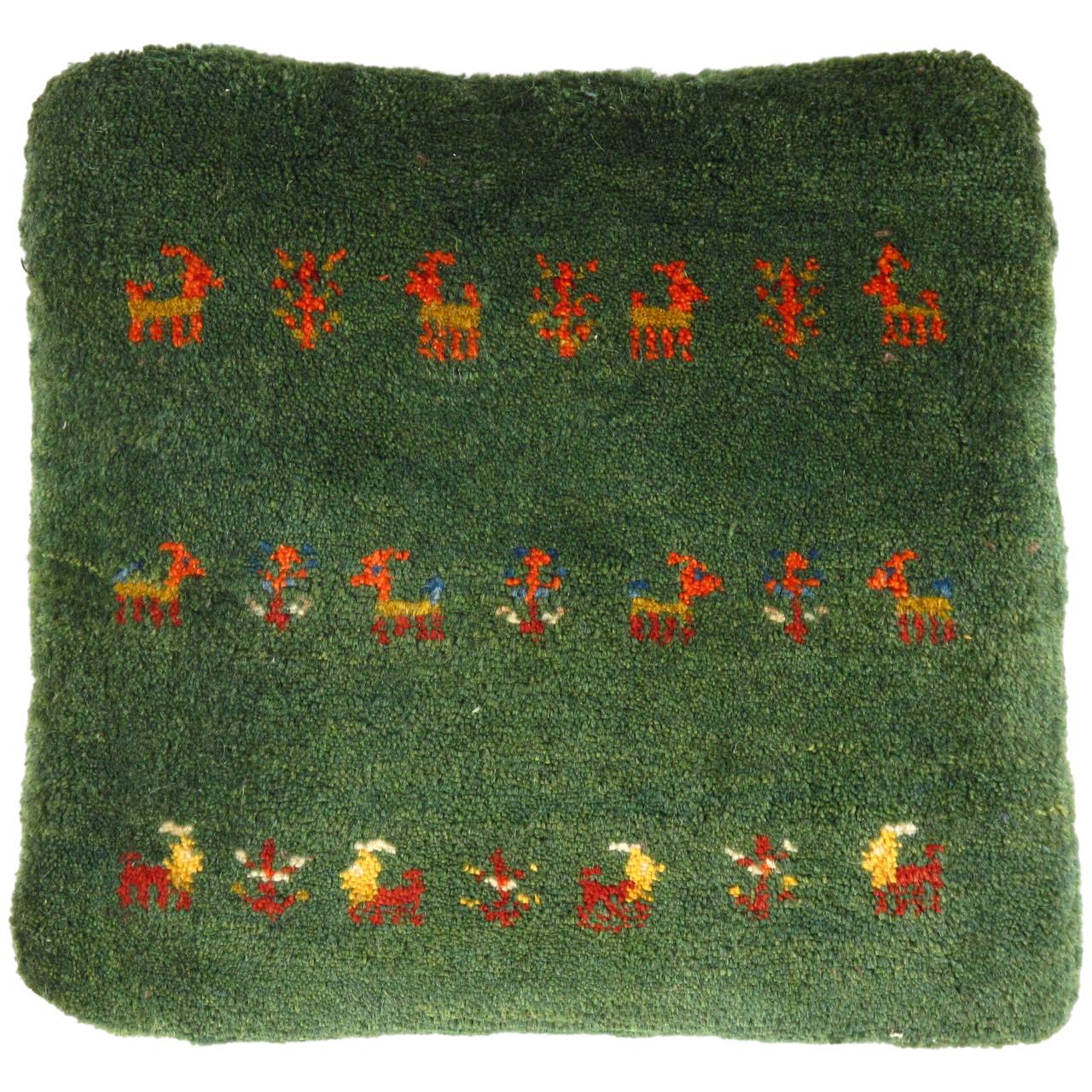 The word “Gabbeh” literally translates to “in the rough,” and it is an accurate description of this style of Persian rug. Gabbeh carpets are woven on makeshift ground looms constructed both of materials that are kept and hauled for long distances by the nomadic tribel, and also of materials that are found at each site where the tribe sets up camp. Due to the fact that part of the loom must be found at each site, a wide variety is introduced. Thus, these rugs are usually somewhat irregular in shape. But, for what they lack in perfectly uniform shape they more than make up for in character, durability and uniqueness.This Gabbeh pillow is made of high-quality LAMBS WOOL The piece was crafted with good workmanship.