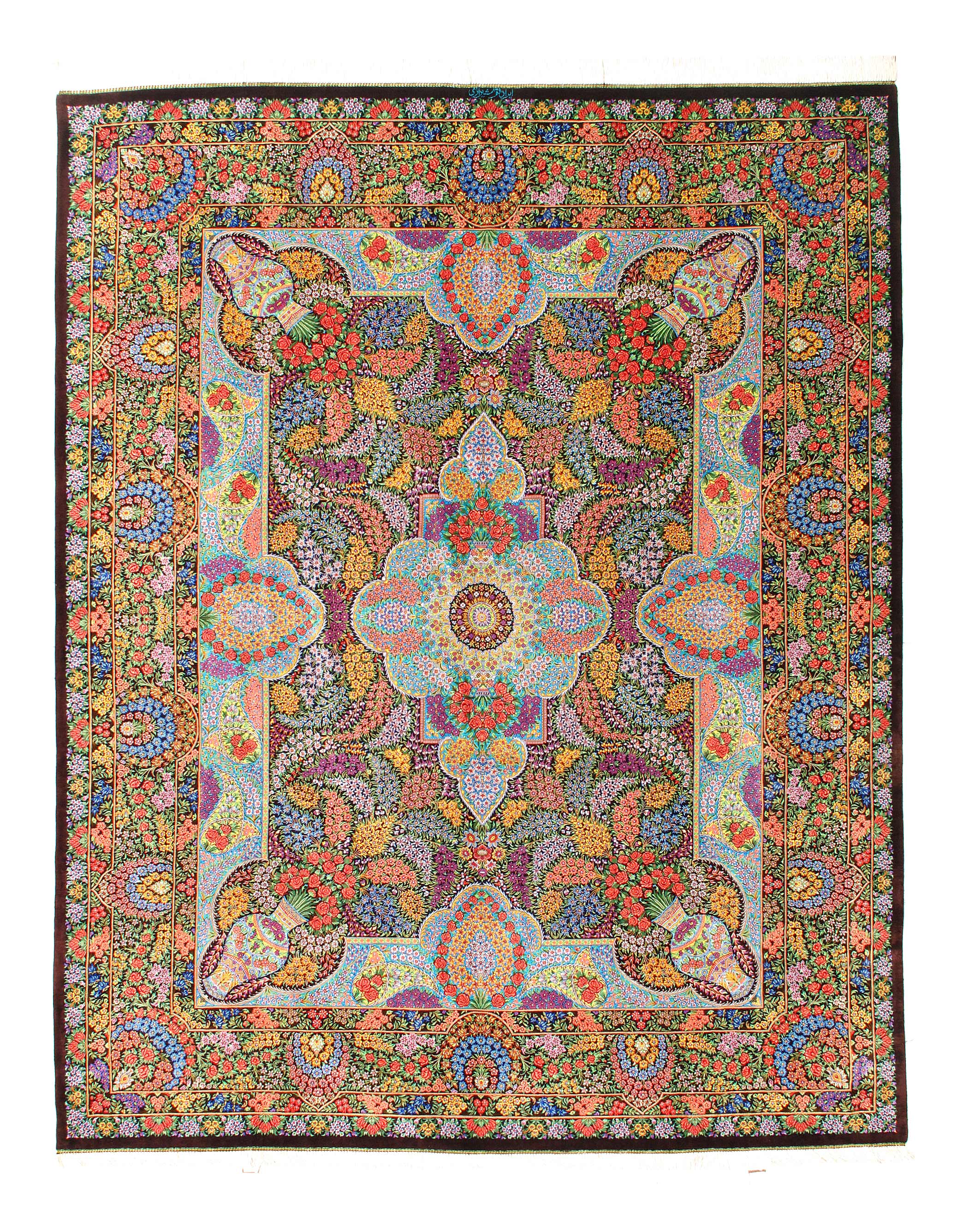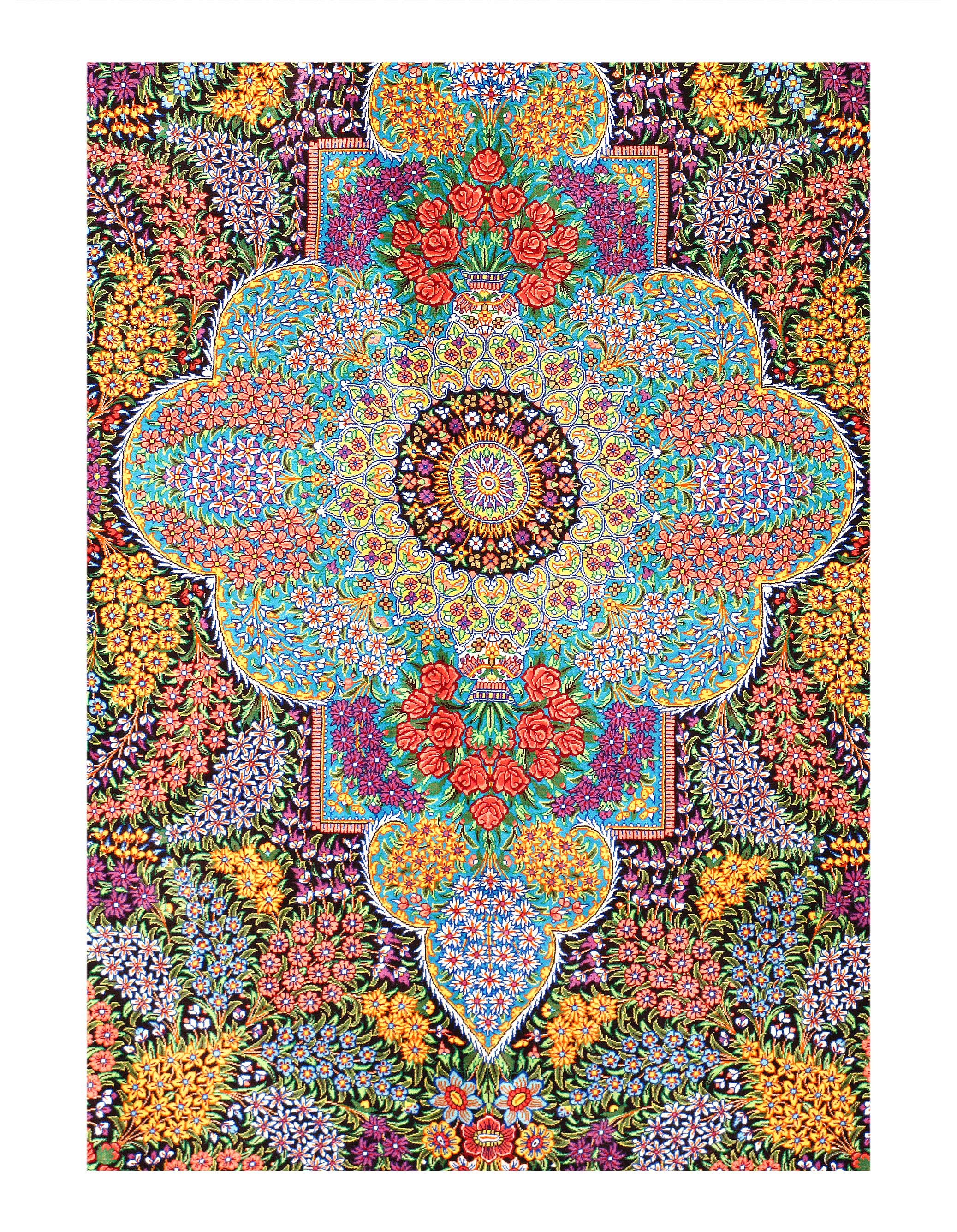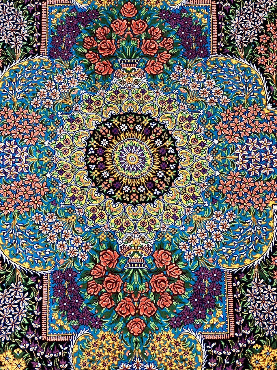 This Qum (also called: Qom) carpet is pure luxury for your home. It consist of natural silk from the city Qum, which is known to possess the highest grade silk in Persia. Its astonishing ornaments made from silk are going to impress without any doubt. The silk reveals new colours and details depending on the angle of how light is reflected. This carpet is a unique piece of art .