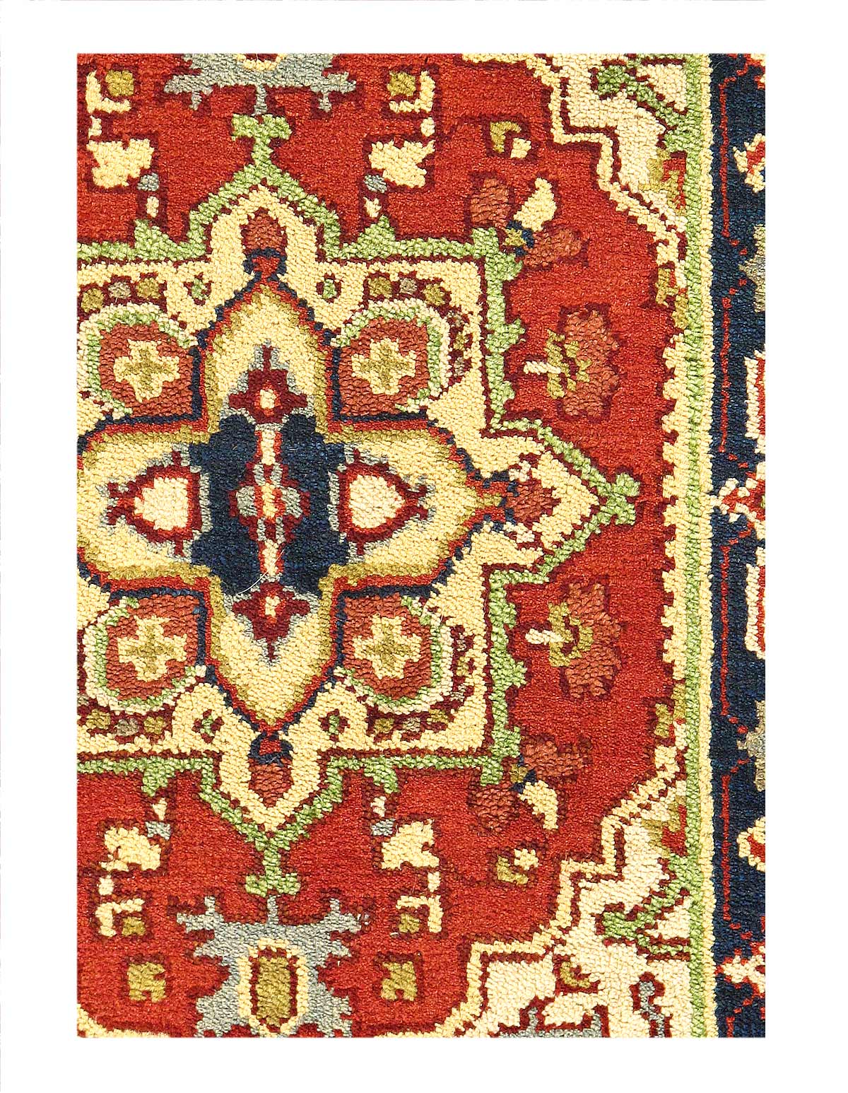 Indo Serapi design rug. Handmade Hand-knotted in fine lambswool. Lamb's Wool on a Cotton Foundation Vegetable Dyed Hand-Spun Wool Rug The Serapi Rug is one of the most sought after rugs particularly in the USA and England for many years. No other rug so epitomizes the "East Coast Establishment" than the Serapi carpet This rug has a dense, soft pile, and excellent quality, to ensure that you will enjoy the look and feel of your rug for years to come