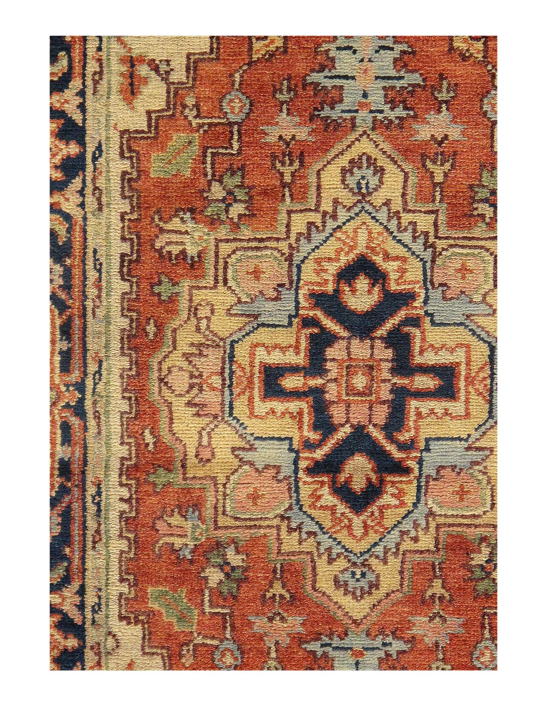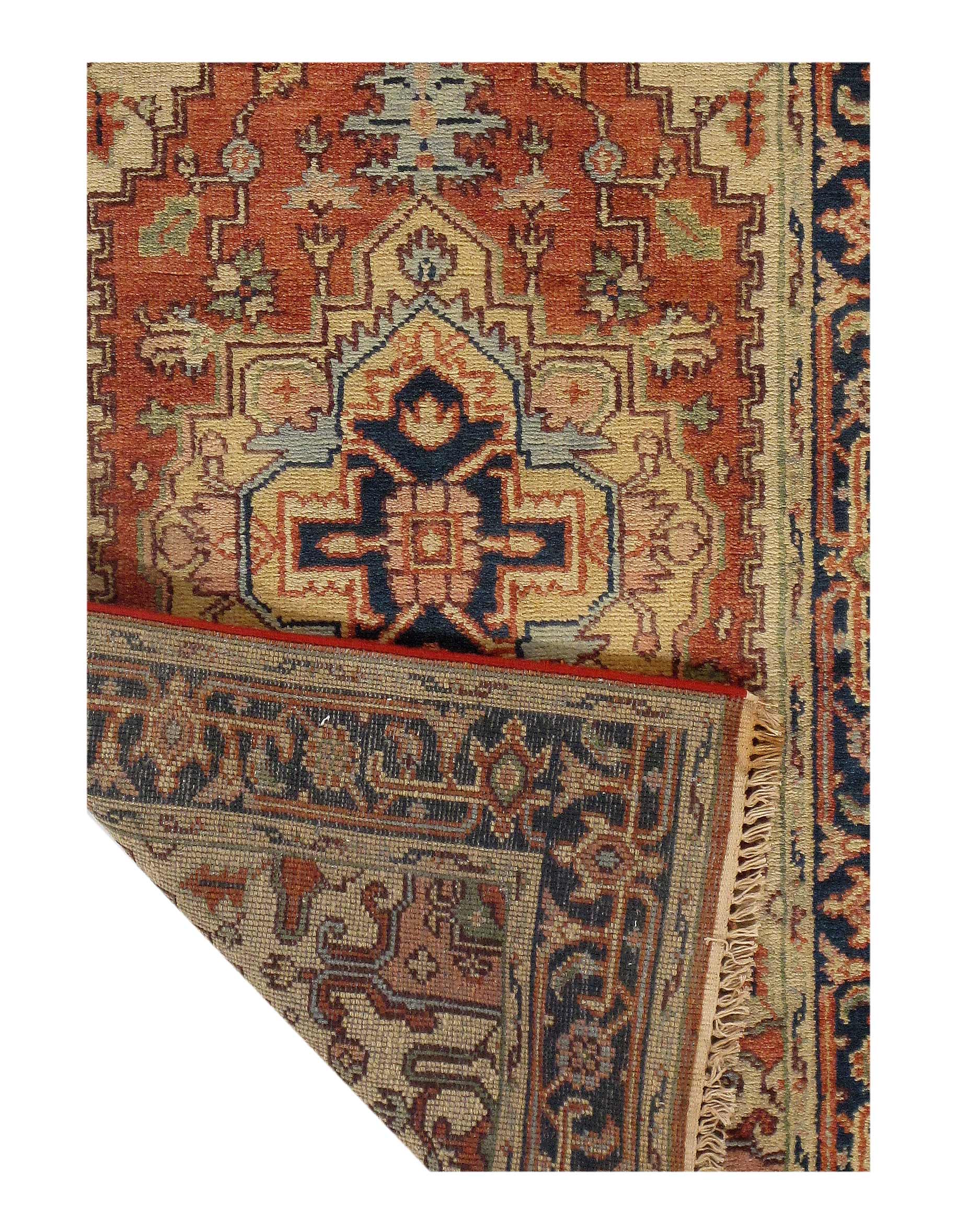 Indo Serapi design rug. Handmade Hand-knotted in fine lambswool. Lamb's Wool on a Cotton Foundation Vegetable Dyed Hand-Spun Wool Rug The Serapi Rug is one of the most sought after rugs particularly in the USA and England for many years. No other rug so epitomizes the "East Coast Establishment" than the Serapi carpet This rug has a dense, soft pile, and excellent quality, to ensure that you will enjoy the look and feel of your rug for years to come D08958