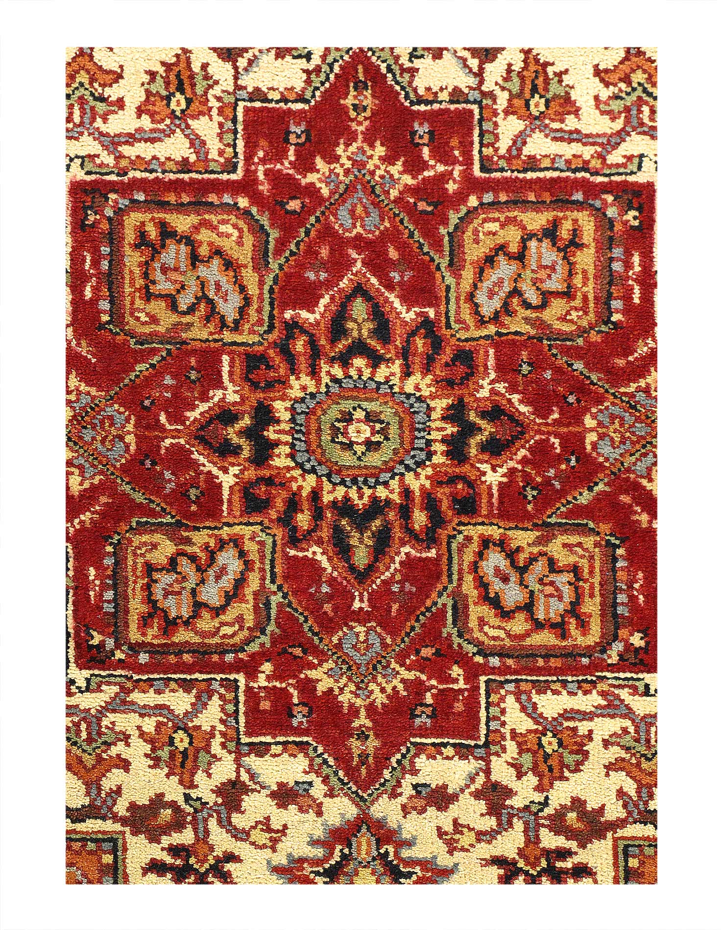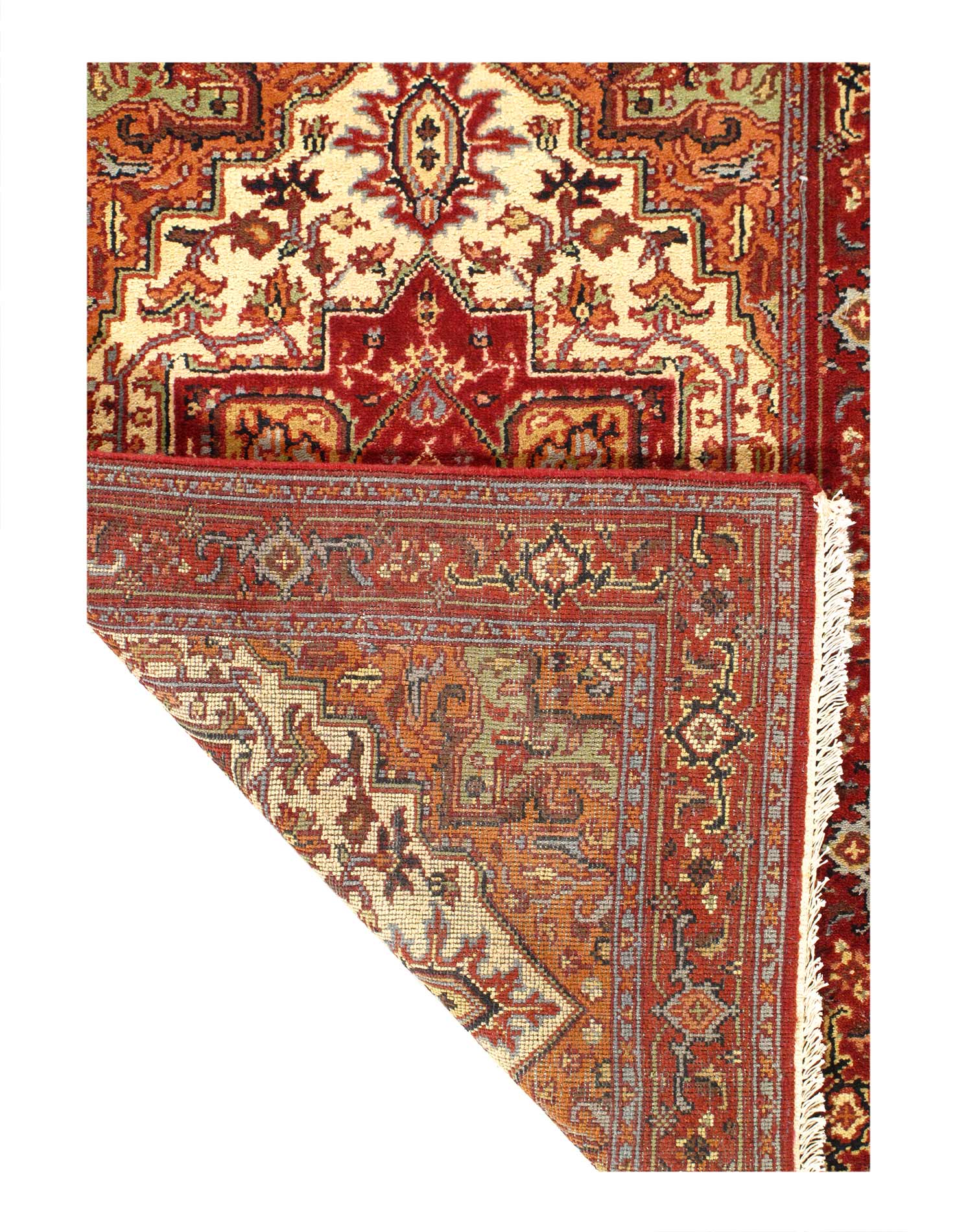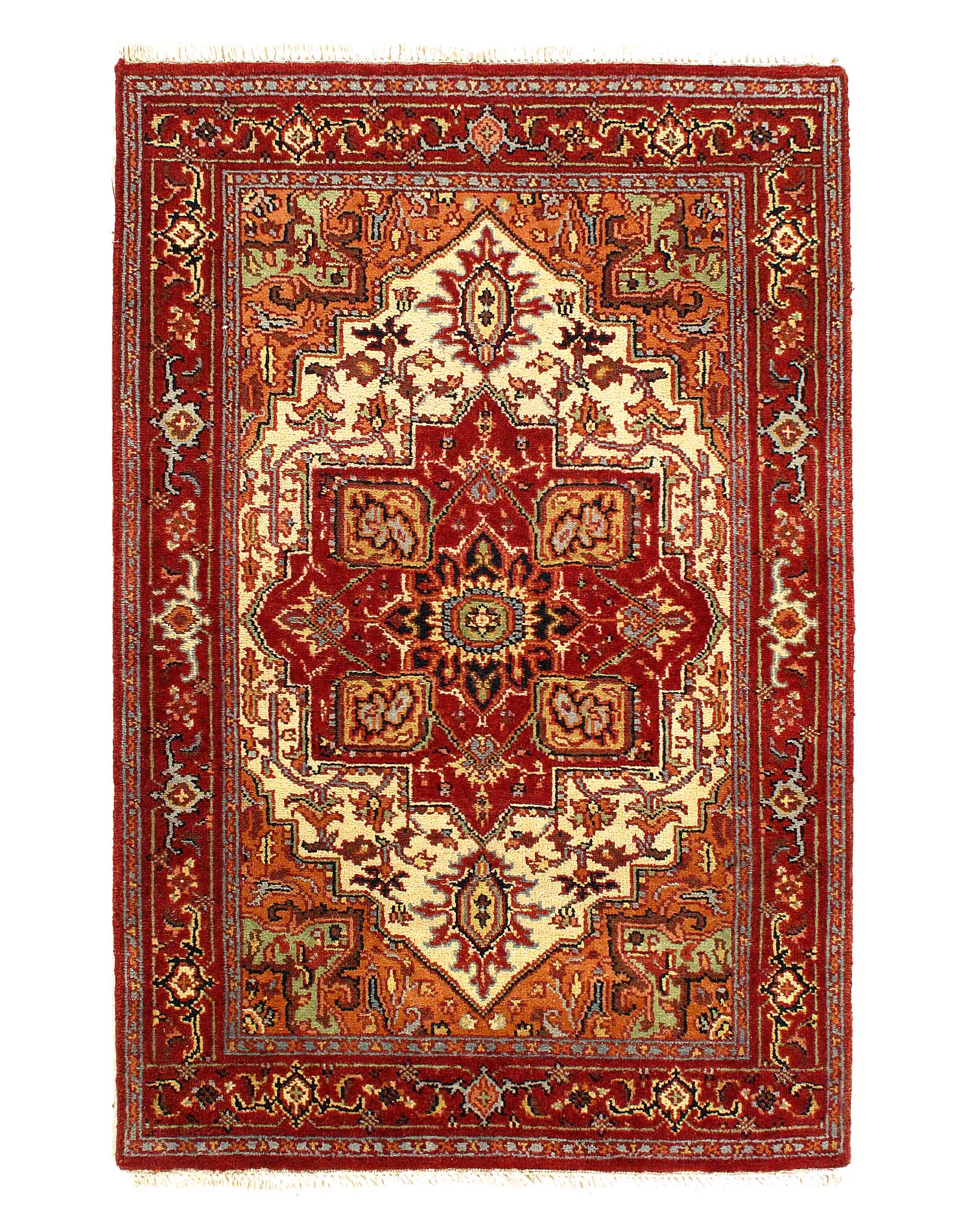 Indo Serapi design rug. Handmade Hand-knotted in fine lambswool. Lamb's Wool on a Cotton Foundation Vegetable Dyed Hand-Spun Wool Rug The Serapi Rug is one of the most sought after rugs particularly in the USA and England for many years. No other rug so epitomizes the "East Coast Establishment" than the Serapi carpet This rug has a dense, soft pile, and excellent quality, to ensure that you will enjoy the look and feel of your rug for years to come #D11175