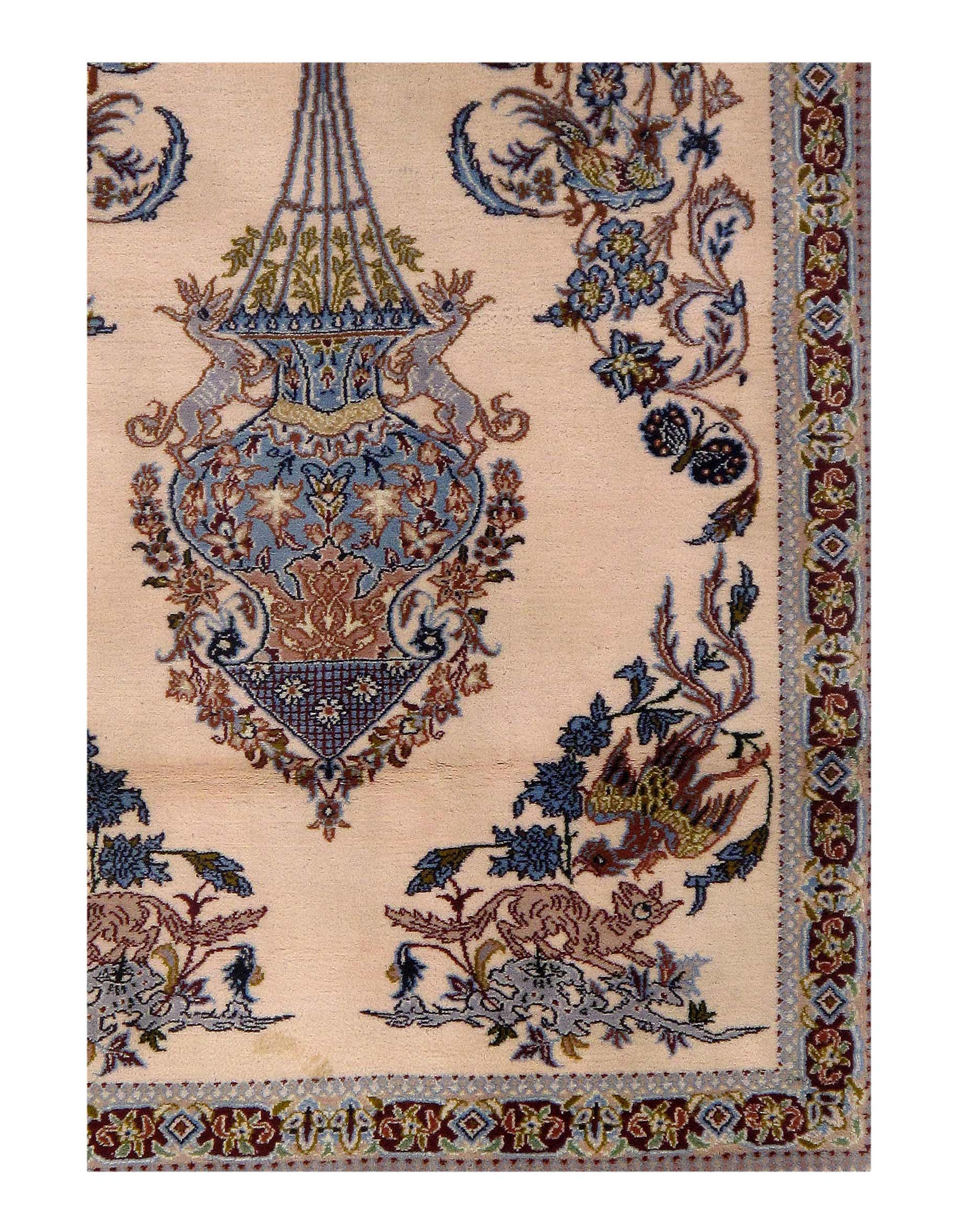 The Isfahan rugs are made with exceptionally good quality of wool & silk. They use traditional motifs inspired by architectural tiles that once decorated the historical buildings from which these rugs originated in. When it comes to high class designs the composition, patterns, and materials of Isfahan meets those expectations. The motifs usually consist of medallions with palmetts and also figural motifs. Isfahan rugs have an extremely high knot density and are woven with silk and golden threads, which give them their luxurious look.