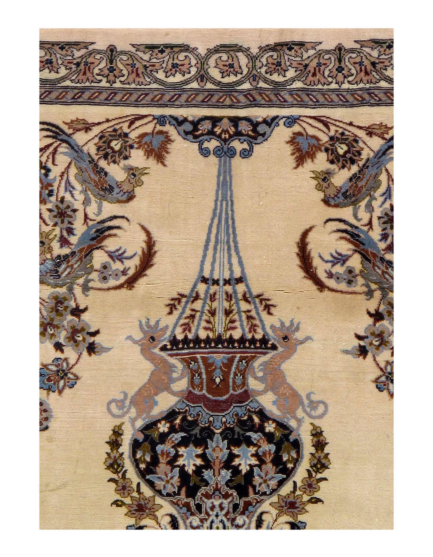 The Isfahan rugs are made with exceptionally good quality of wool & silk. They use traditional motifs inspired by architectural tiles that once decorated the historical buildings from which these rugs originated in. When it comes to high class designs the composition, patterns, and materials of Isfahan meets those expectations. The motifs usually consist of medallions with palmetts and also figural motifs. Isfahan rugs have an extremely high knot density and are woven with silk and golden threads, which give them their luxurious look.